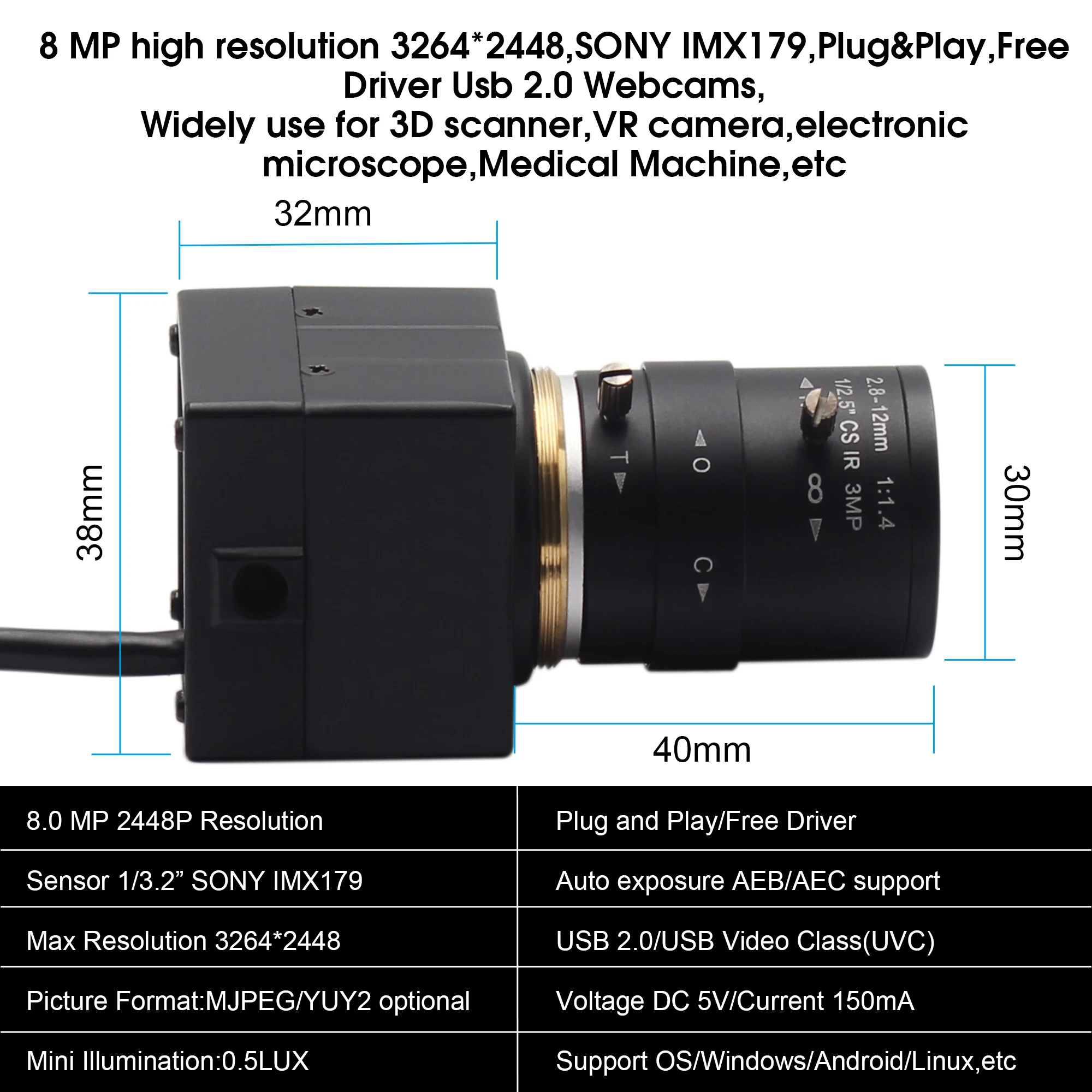 8MP2.8-12 мм ручная камера видеонаблюдения с переменным фокусным расстоянием usb Sony IMX179 металлическая коробка usb камера для промышленного оборудования