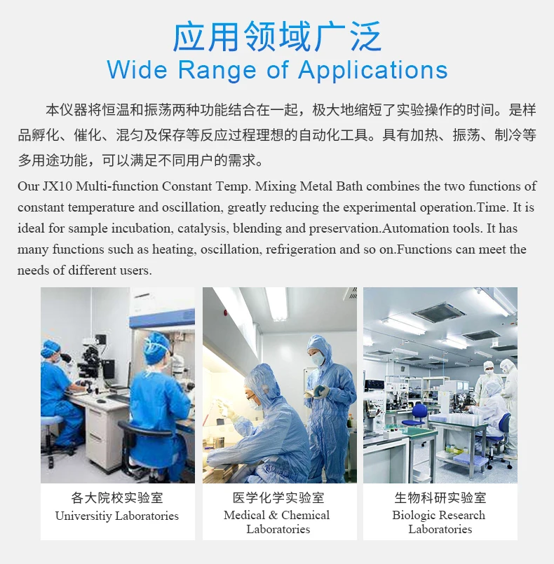 JXH-100 прекрасно сочетает в себе две функции постоянной температуры и колебания, значительно сокращая время экспериментальной операции. Это идеальный автоматический инструмент для инкубации образцов, катализа, смешивания и сохранения. С нагревом, колебанием, охлаждением и другими многофункциональными функциями, может удовлетворить потребности различных пользователей.