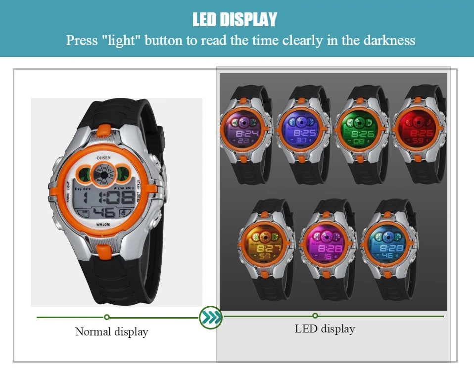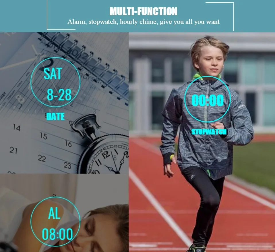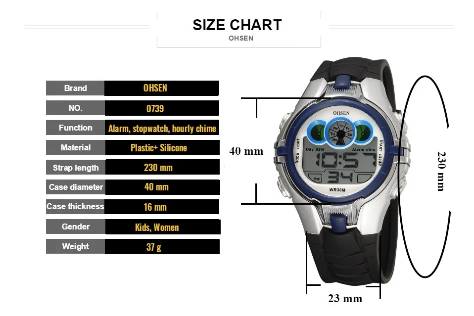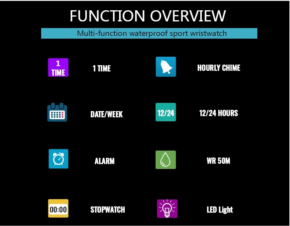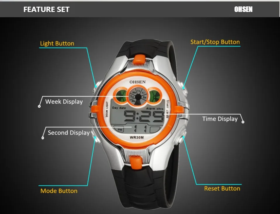 1. 100% абсолютно новый высококачественный 2. Дополнительная функция сигнализации 3. Отображение времени, минуты, секунды и дня недели 4. Специальная конструкция с хронограф (секундомер) при температуре не выше 0,01 второй шаг 5. Дополнительный задний светильник для четкого отображения времени в темноте 6. Четыре кнопки для управления различными функциями (настройка времени, настройка будильника, день просмотра и т. д.) 7. Глубина водонепроницаемости до 30 м (пожалуйста, не нажимайте кнопки в воде)