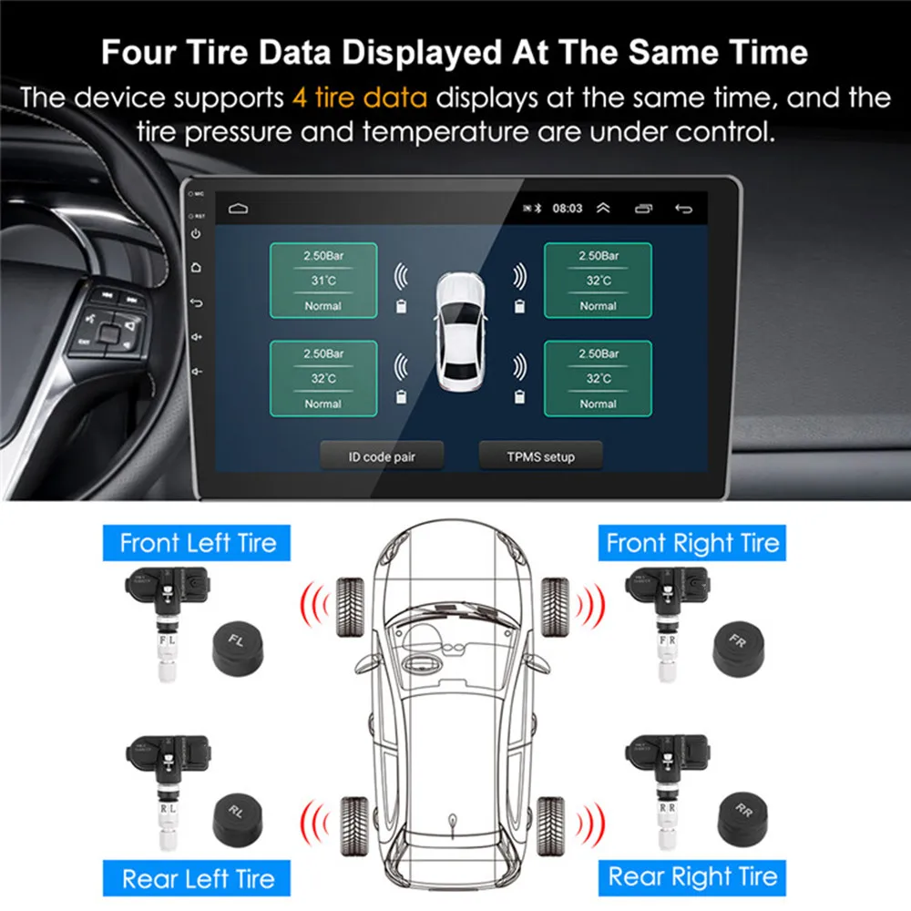 -Динамический монитор давления в шинах на 4 колеса в одно и то же время, предотвращает повреждение от спустило колесо, повысить эффективность использования топлива, продлить срок службы шин срок службы, обеспечить безопасность вождения.