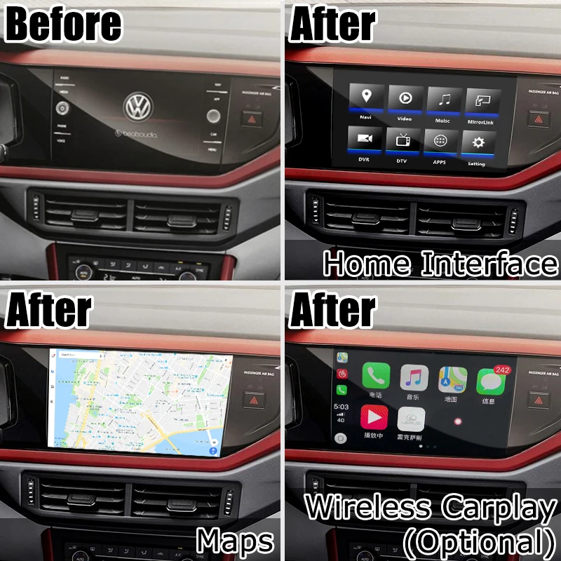 Android видео интерфейс-это своего рода Andrid система обновления от оригинального автомобильного экрана, для VW Skoda и Seat автомобилей, вы можете использовать кнопки на центральной консоли и рулевом колесе и оригинальный сенсорный экран для управления всем, вы можете найти, что система Android работает в видео в верхней части страницы.