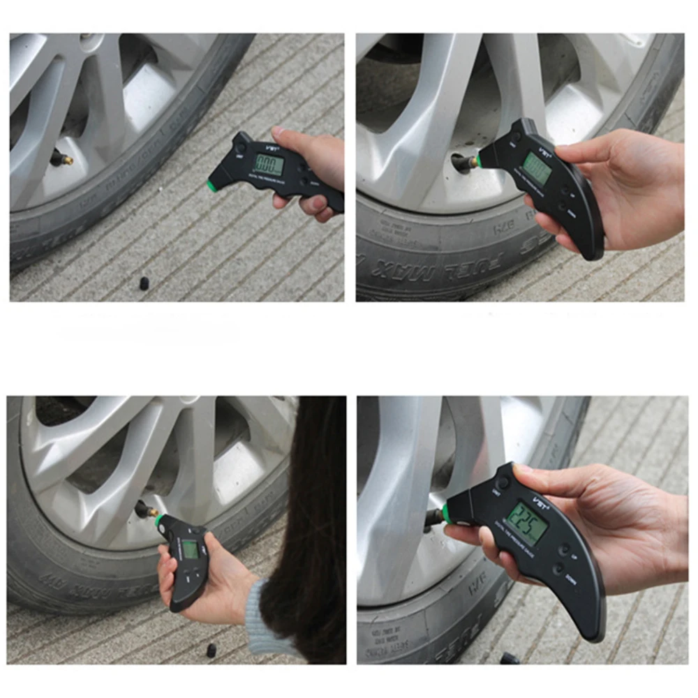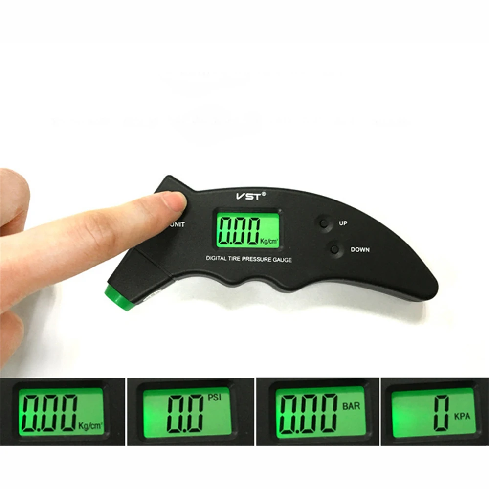 Car Tire Pressure Gauge Auto Bike Motorcycle Tyre Air Pressure Meter Tester High Precision Electonic Monitor Diagnostic Tool Specification:Measure range:3-150PSIMeasure pricision:±1PSIResolution:0.5PSIWorking temperature:-20~60 Description:A.Nozzle:Reads tire pressureB.Unit button: Turn on gauge/selects units/holds for 5 seconds to turn off gaugeC.LCD display: Displays selections/readings/warning red flashlight(Pressure unit:PSI|BAR|KPA|KG)D.UP button: Increase setting options/holads for 3 seceonds to preset a target pressureE.Down button:Decrease setting options/holds for 3 seconds to preset a target pressure Notice:1.Push and hold the nozzle on the gauge aganiest the valve stem unitl the pressure reading is displayed and locked.2.If your tire pressure is 15% lower or 25% higher than the preseted pressure,warning red light will flash. Package including:1 x Car Tire Pressure Gauge