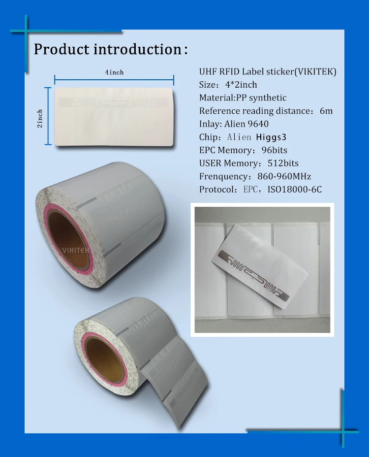 500 шт. 9640 PP этикетка UHF RFID стикер Самоклеящиеся 6c пассивная бирка 915 МГц метка для чипа Размер этикетки: 101,6*50,8 мм Материал: синтез ПП Чип: Alien Higgs3 Инкрустация: Alien 9640 Память EPC: 96 бит Память пользователя: 512 бит Частота: 860-960 МГц Контрольное расстояние считывания: 6 м Протокол: EPC Class1 Gen2,ISO18000-6C