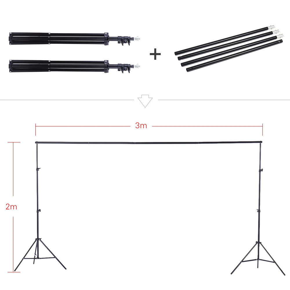 1 Набор подставки для фона 2 м * 3 м изготовлен из высококачественного алюминиевого сплава, в его стендах используются быстрые замки, а перекладина состоит из 4 отдельных палочек, что позволяет легко регулировать высоту и ширину.