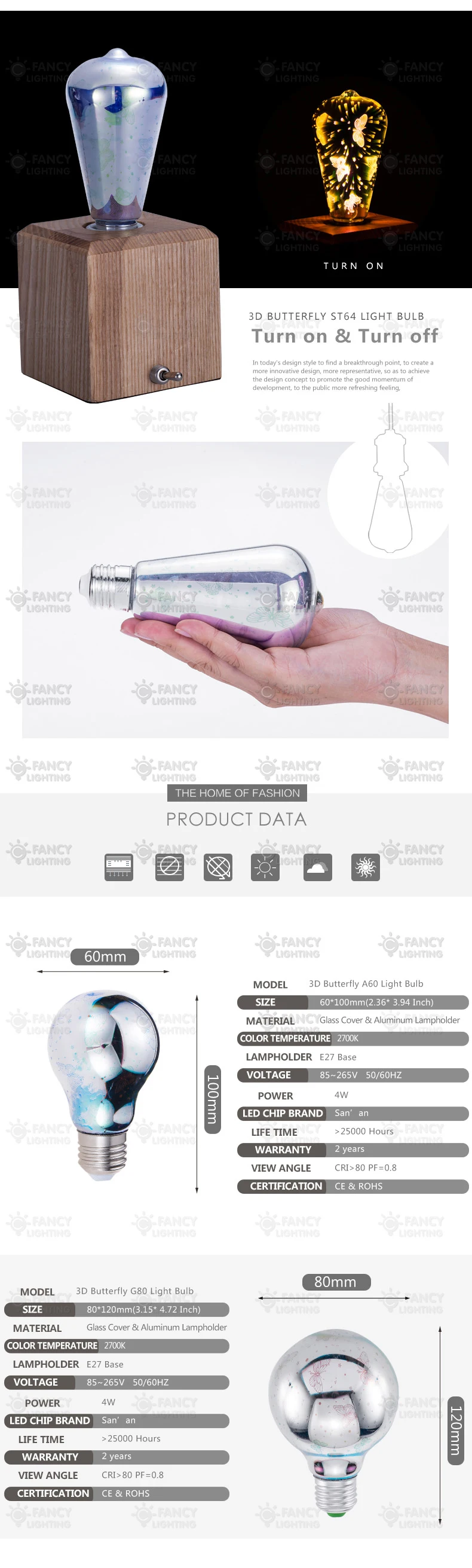 Модель:A60 и ST64 и G80 и G95 и G125-3D-Butterfly лампочки