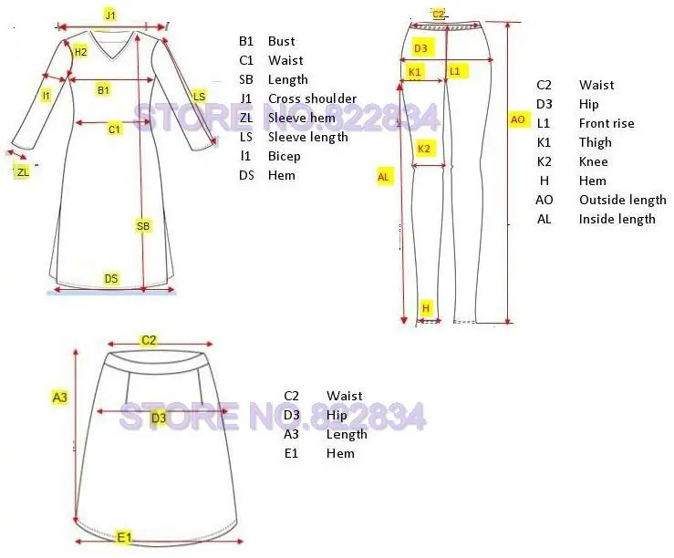 1. As all of our garments are hand-sewn and customer tailored, the finished garments may vary by approximately 1-3cm in the specified measurements.