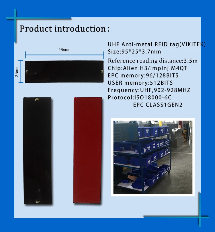 20 шт UHF RFID Анти-металлическая бирка PCB 6c пассивная бирка 915 МГц Протокол: EPC класс 1 Gen2, ISO18000-6C Частота: UHF, 902-928 МГц Размер: 95*25*3,7 мм Материал: PCB Чип: Alien Higgs3/Impinj Monza4QT Память EPC: 96 бит/128 бит Память пользователя: 512 бит Вес: 17 г Рабочая температура: от-30 ℃ до + 85 ℃ IP Рейтинг: IP67 Приблизительное расстояние считывания: 3,5 м