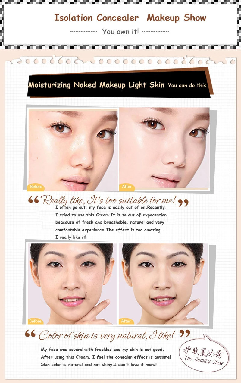 Мое лицо было покрыто веснушками, и моя кожа не хороша, после использования этого крема, я чувствую, что эффект консилера потрясающий! Цвет кожи натуральный и не блестящий, мне это больше не нравится