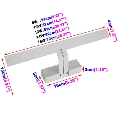 Dimension | Base: 16cm(L)/6.3"x5cm(W)/1.97"x3cm(H)/1.18"; Light Fixture: 10W: 37cm(14.57")x4cm(1.57")x15cm(5.91"); 12W: 53cm(20.87")x4cm(1.57")x15cm(5.91"); 14W: 62cm(24.41")x4cm(1.57")x15cm(5.91"); 16W: 72cm(28.35")x4cm(1.57")x15cm(5.91"); |