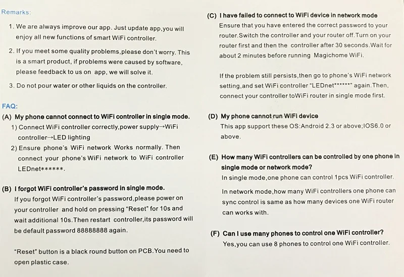 6. Способ подключения: V +,R,G,B светодиодный светильник, V +,V-для источника питания, ANT для приема сигнала WIFI.