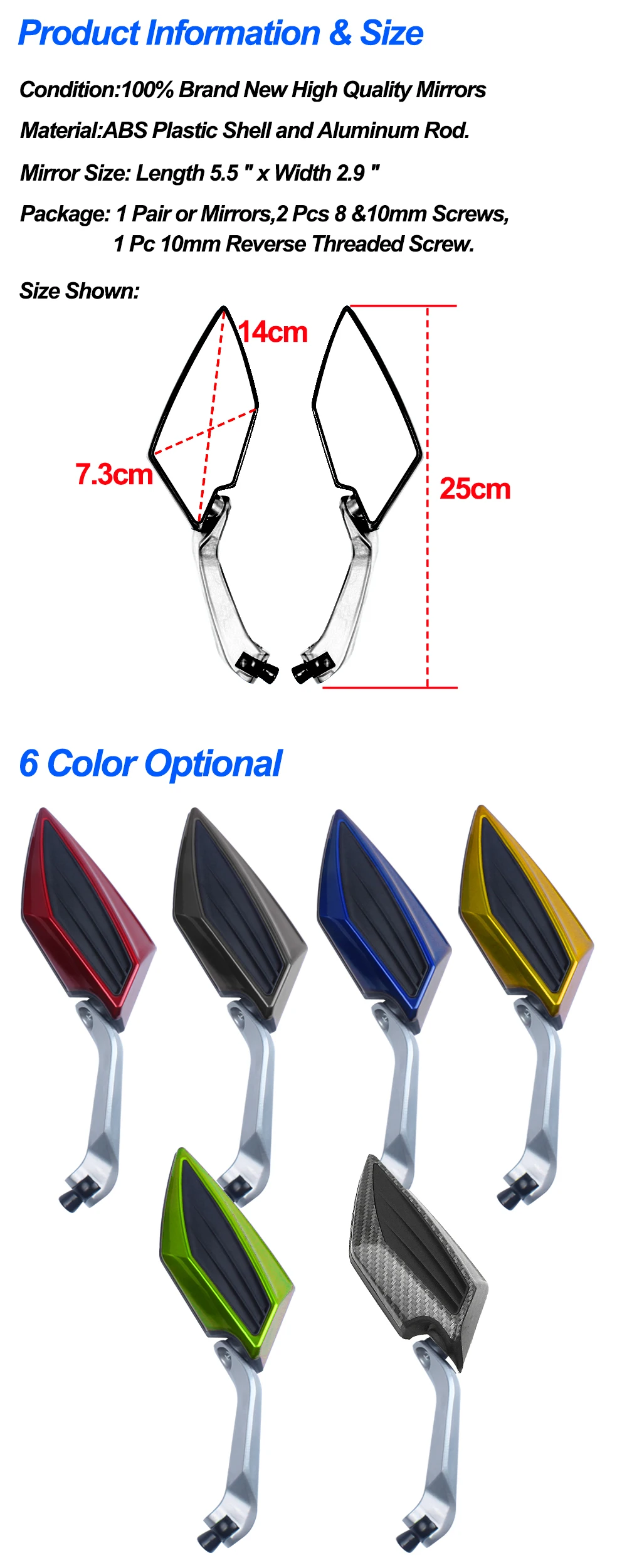 100% абсолютно новый Материал: ABS пластиковый корпус и алюминиевый стержень Цвет: черный, красный, зеленый, белый, углеродистый Волокно, золото Поворот: регулируется по горизонтали и вертикали Количество: одна пара (слева и справа) Зеркало Размеры: Длина 5,5 "x Ширина 2,9" (14 см х 7,3 см) Длина стержня: 4 1/3 дюйма (11 см) Диаметр монтажного винта: 8 мм Зеркало Цвет: Прозрачный
