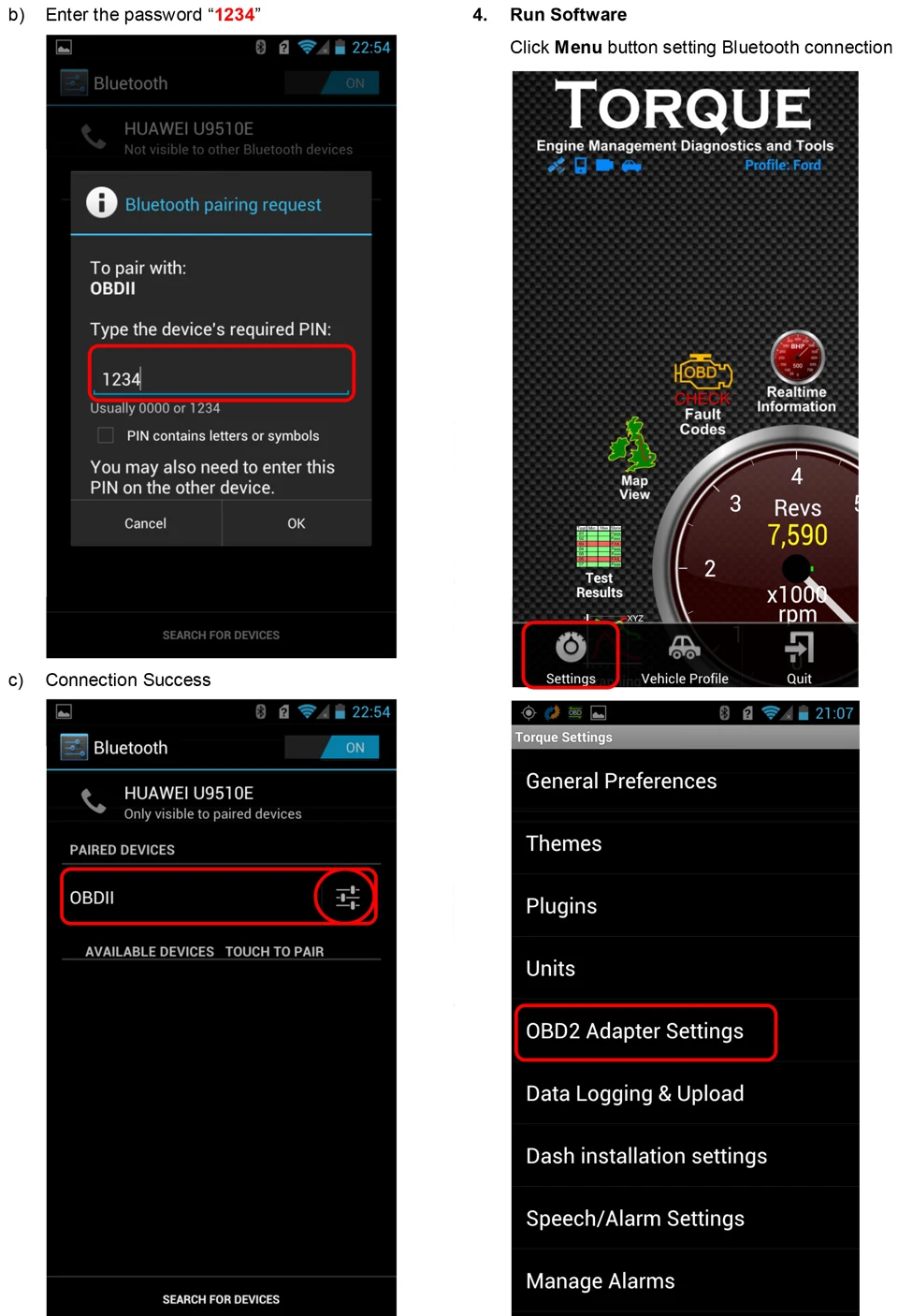 ①. Откройте настройку вашего Android и выполните поиск Bluetooth ELM327 : OBDII, затем введите пароль 1234