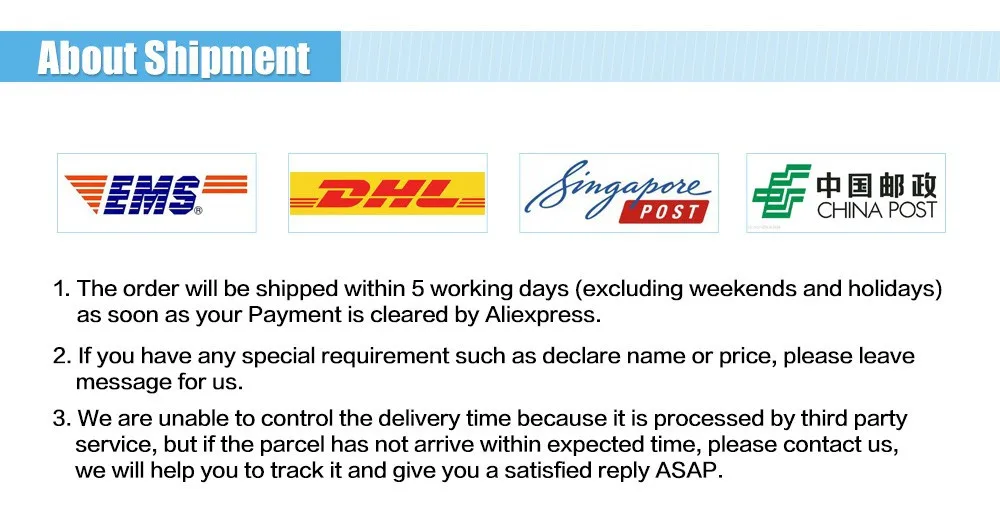 В настоящее время у нас есть склад в России, Германии, США и Соединенном Королевство, там мы можем предоставить вам бесплатную и быструю доставку; заказы на китайский склад, мы можем улучшить вашу доставку.