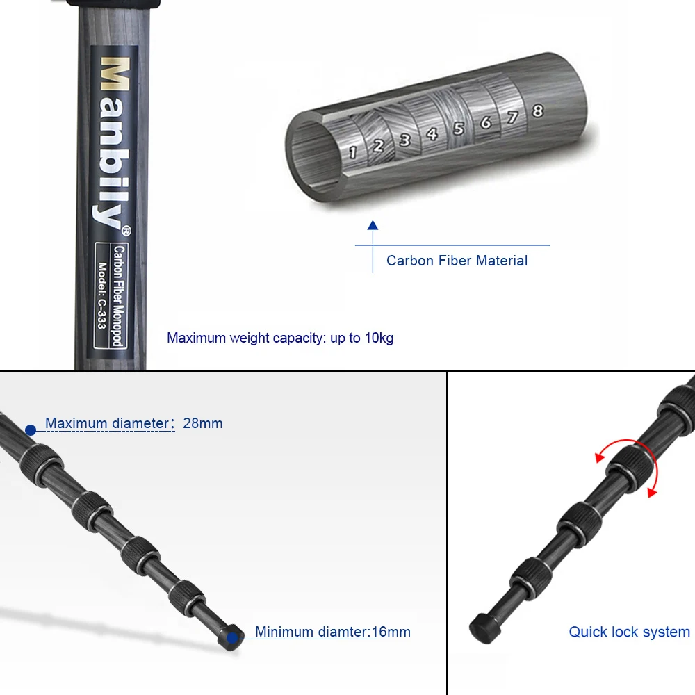 Монопод из углеродного волокна, легкий и удобный для переноски.