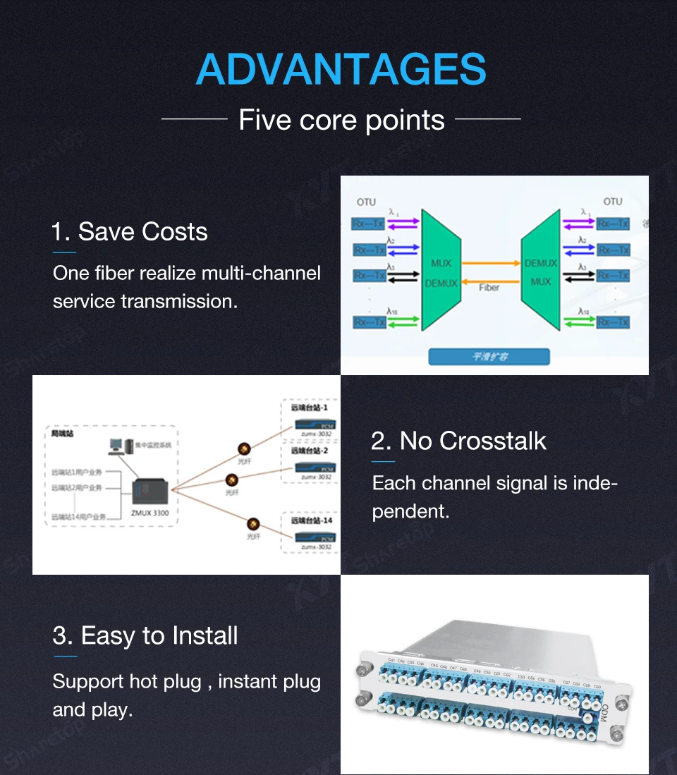 DWDM многоканальный мультиплексор/демультиплексор (Mux /DeMux)Модули доступны в диапазоне каналов ITU 100 ГГц. Они демонстрируют низкую потерю, нечувствительность к температурам и надежную производительность в любом системном приложении. Модули Mux/DeMux предлагают недорогие решения по управлению волнами, которые подходят для дальних поездок, метро и доступа.