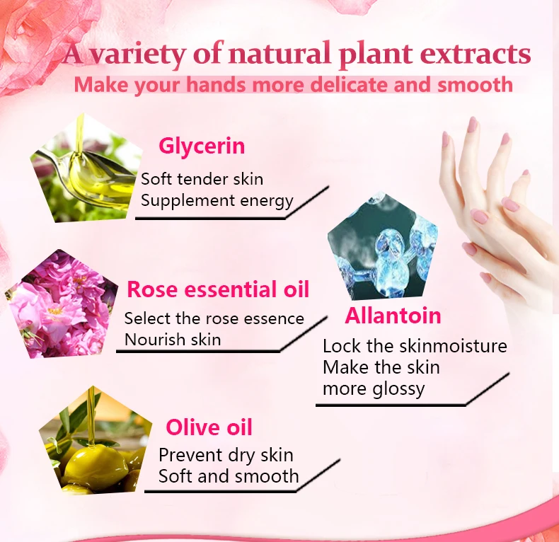Экстракты розы тщательное пополнение увлажняющая Вода мягко защищает кожу рук, добавляют пептидные укрепляющие ингредиенты снимают сухие и тонкие линии, вызванные сухостью, улучшают состояние увлажнения кожи, увлажненная Защитная мембрана на поверхности кожи, потеря влаги не легко тщательное увлажнение кожи, вытрите блестящие гладкие руки.