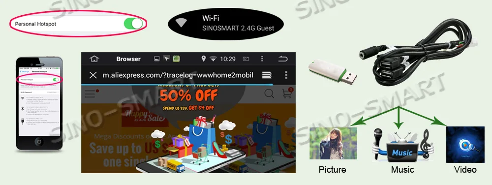 5. Встроенный Wi-Fi (посетите Интернет через телефон hotpot) 6. Музыка и видеоплеер (воспроизведение музыки или видео онлайн, с usb-диска или встроенной памяти)