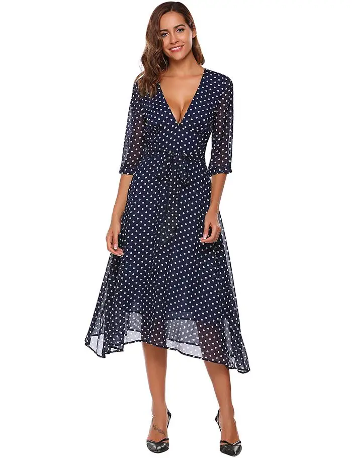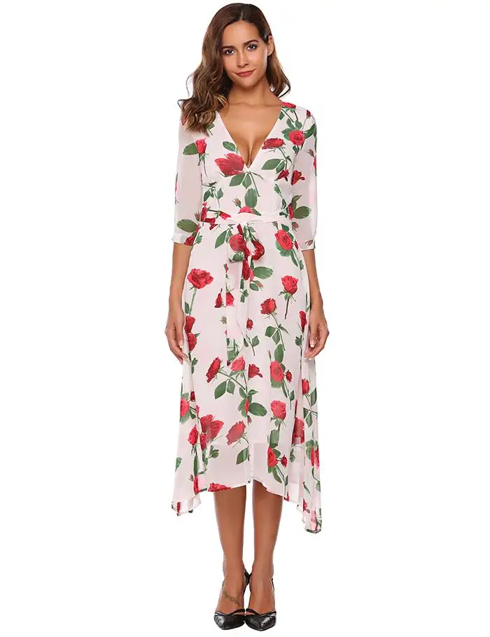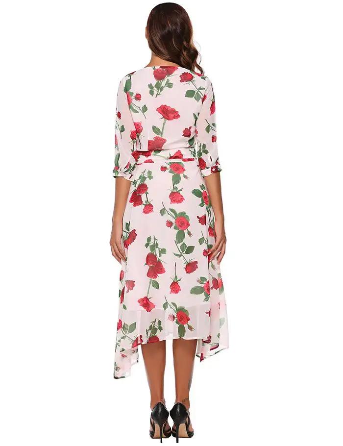 [Style] : ACEVOG Women Vintage Dress Autumn Fashion V-Neck 3/4 Sleeve High Waist Floral Dresses Feminino Vestidos Femme Robe