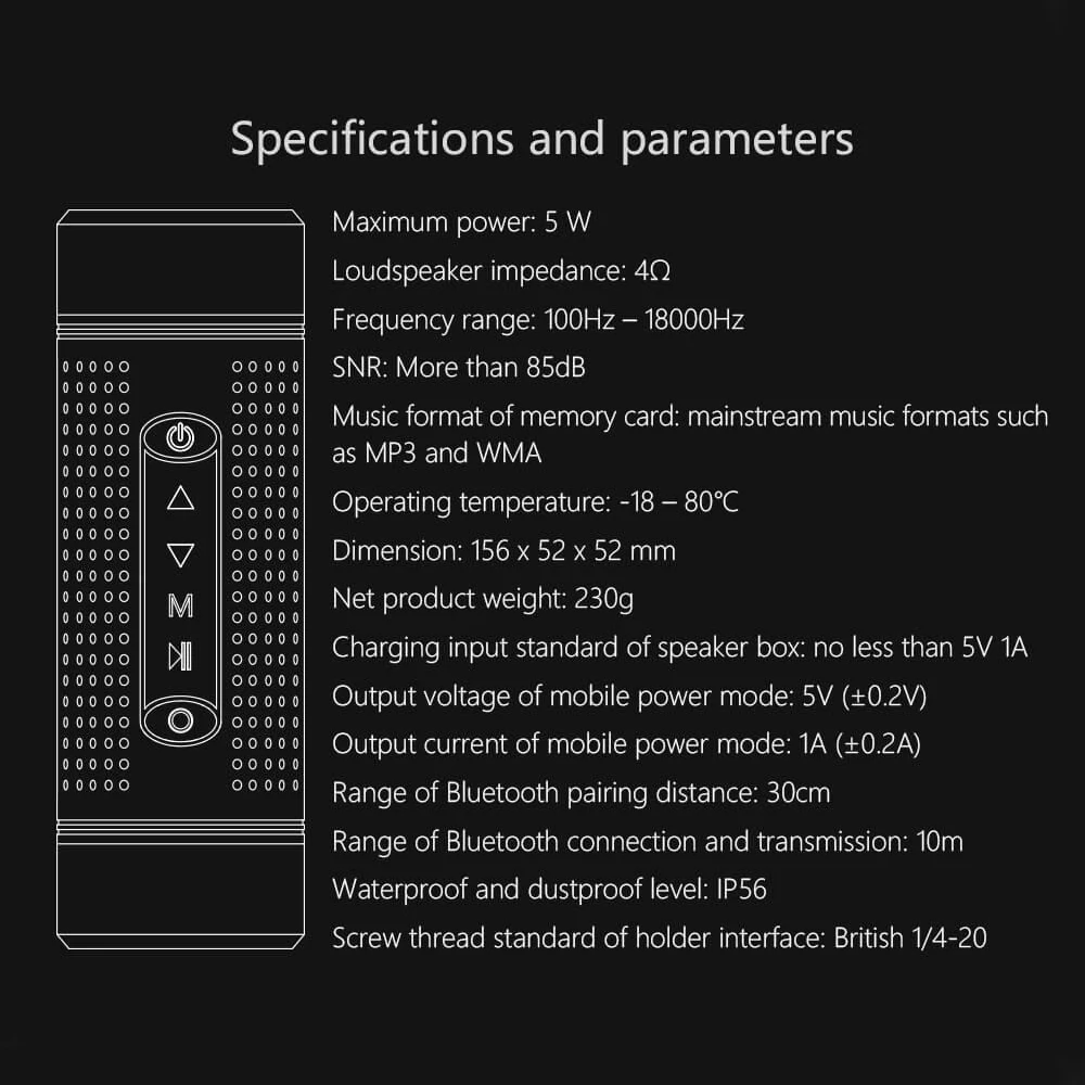 Музыка, хранящаяся на интеллектуальных устройствах, таких как tf-карта, USB, AUX аудио, мобильный телефон, планшетный ПК, ноутбук и т. Д. Можно воспроизводить после подключения к Bluetooth и интерфейсам основного корпуса в нескольких спецификациях.