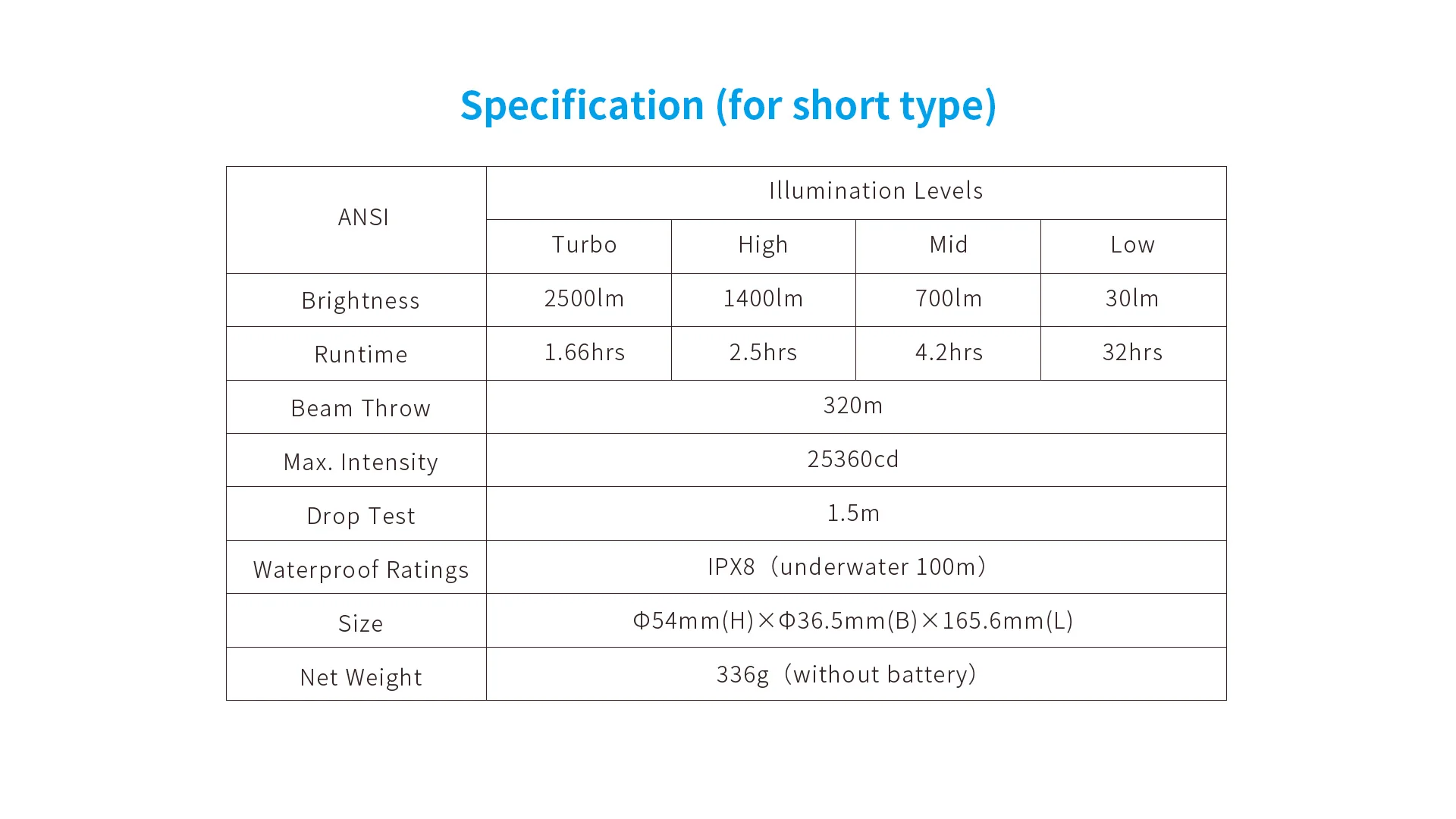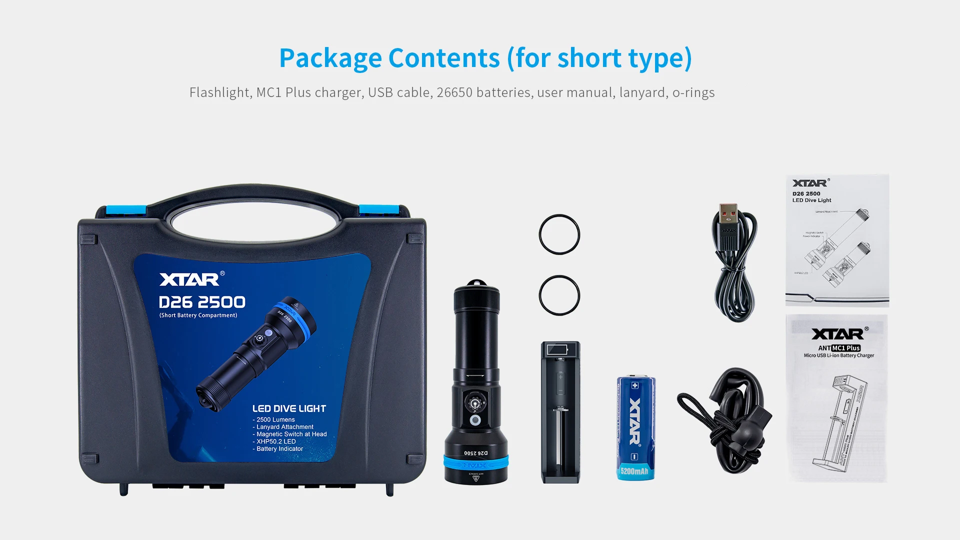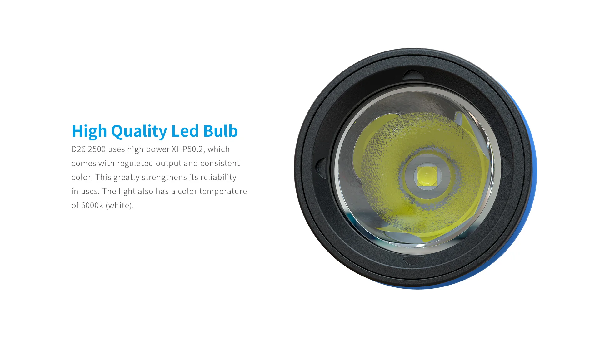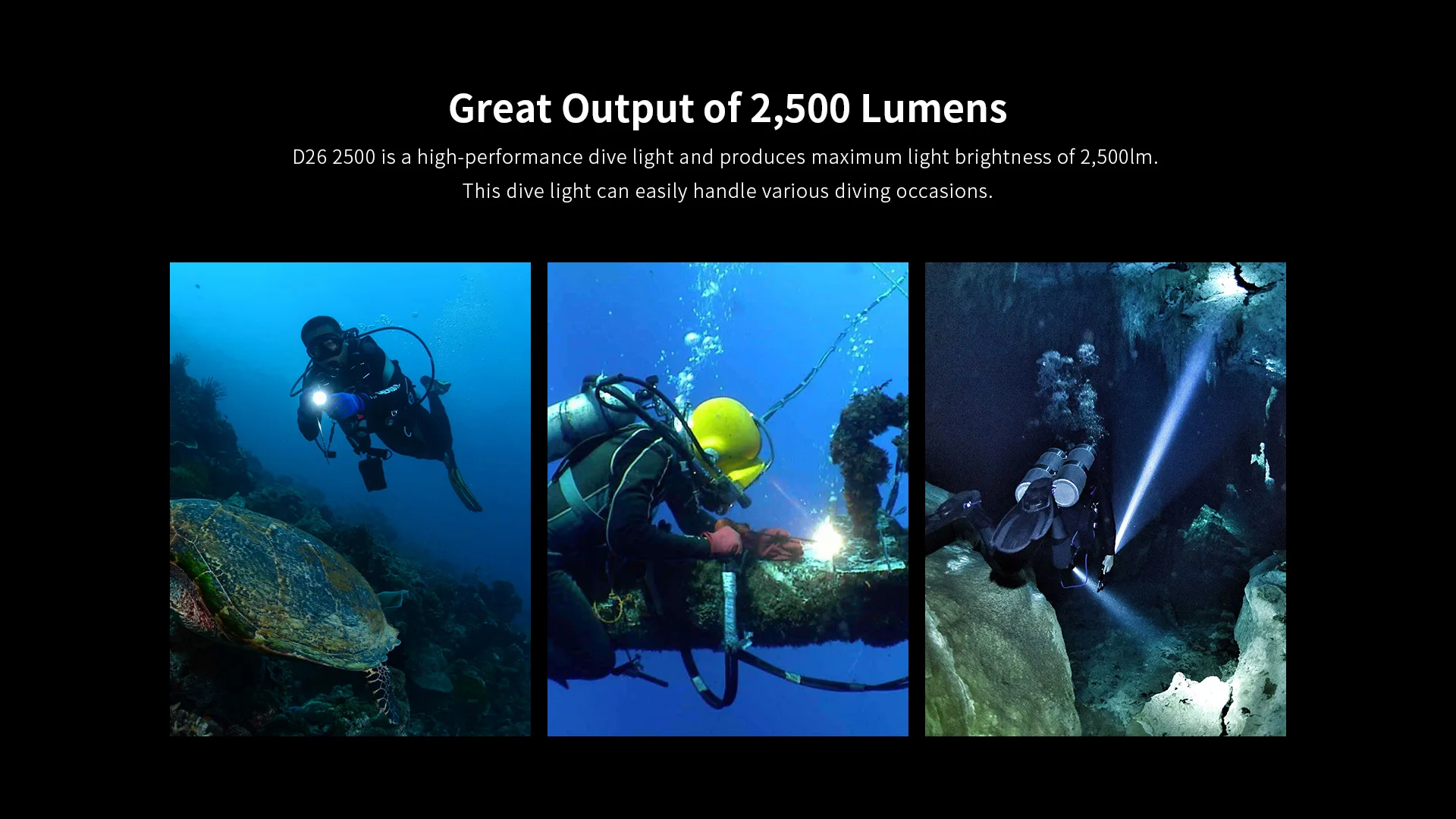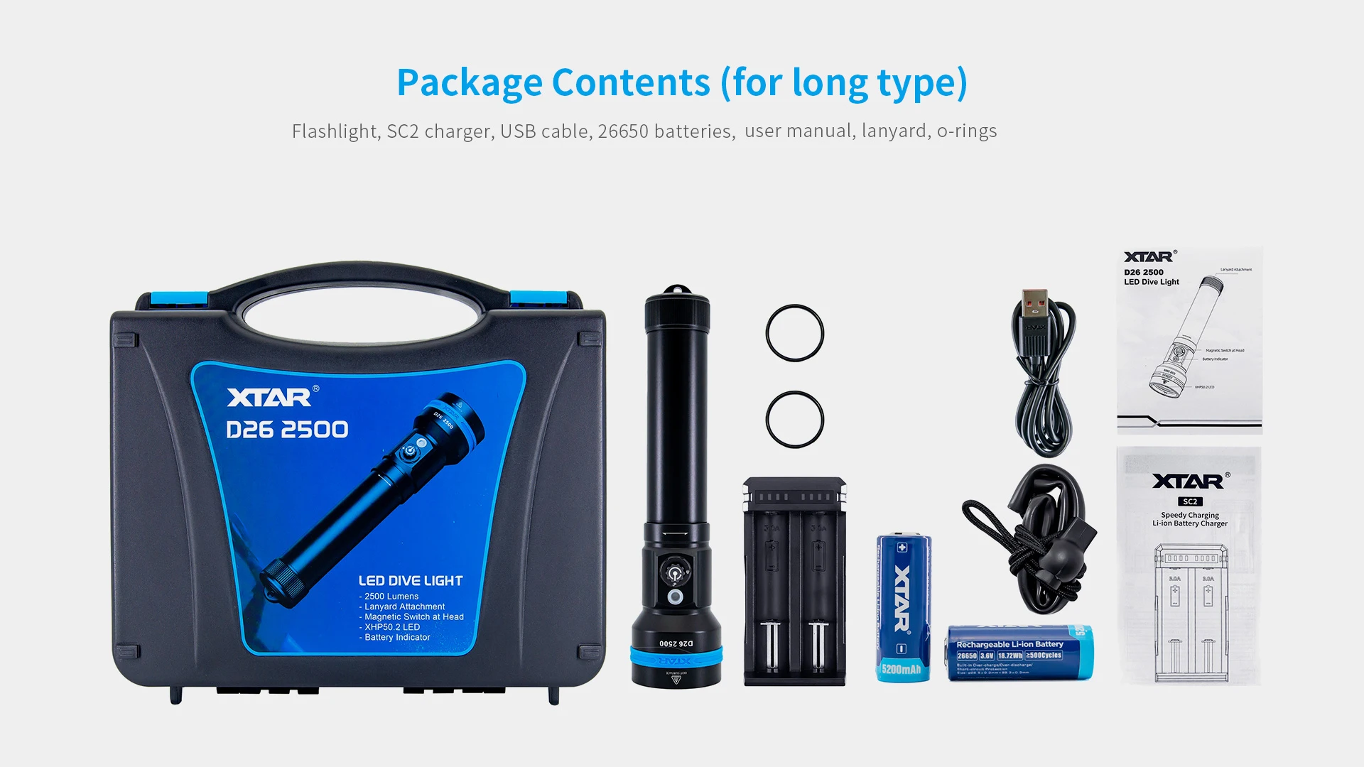 Longer runtime for scuba diving • Great brightness, 2500 lumens output. • Cree XHP50.2 LED, high CRI, color temperature 6000K (white). • Four brightness levels - 2500/1400/700/30lm, meeting different diving needs. • Two-hour runtime, powered by 2x 26650 batteries in long type of D26 2500. • Beam throw 320m to avoid underwater dangers. • Magnetic press switch and lock function, prevention of accidental turn on/off of light. • Power indicator, reverse polarity protection. • Underwater 100m waterproof, corrosion/abrasion-resistant housing. • Smart temperature control.