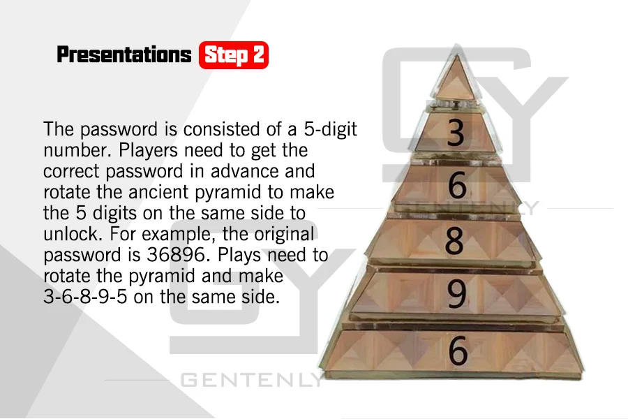 Пароль состоит из 5 цифр. Игрок должен получить правильный пароль заранее и повернуть древнюю пирамиду, чтобы сделать 5 цифр на той же стороне, чтобы разблокировать. Например, оригинальный пароль 12345. Игры должны вращать пирамиду и делать 1-2-3-4-5 на одной стороне.