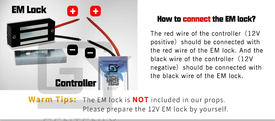 Красный провод контроллера (положительный 12 В) должен быть соединен с красным проводом замка EM. И Черный Провод контроллера (12 В отрицательный) должен быть соединен с черным проводом замка EM.
