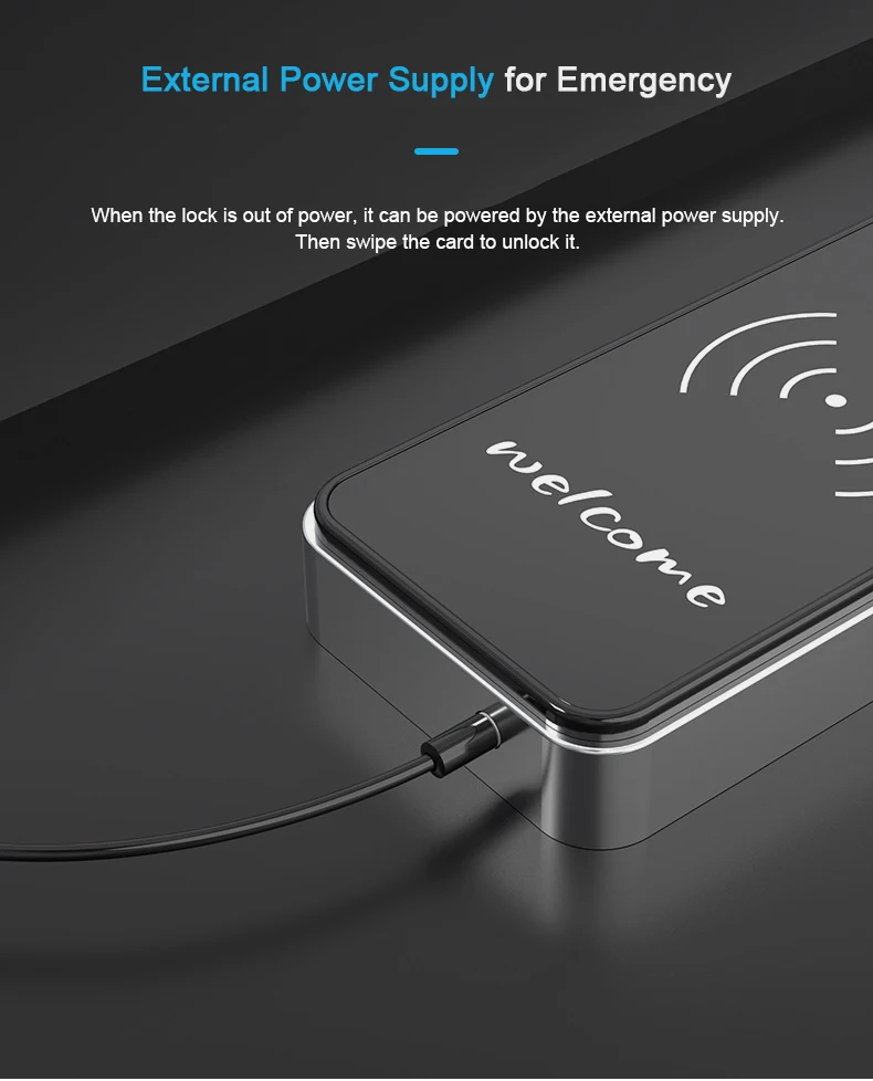 Обычно мы отправляем внешний источник питания с каждым заказом. Вы можете использовать для питания замка и проведите по карте, чтобы разблокировать