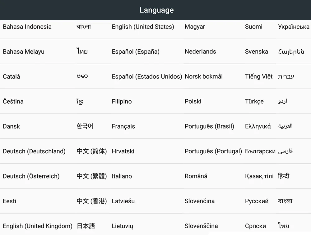 | Язык | Английский, Испанский, Португальский (Бразилия), португальский (Португалия), итальянский, немецкий, французский, русский, Арабский, Малай, тайский, греческий, украинский, хорватский, чешский, упрощенный/традиционный китайский |