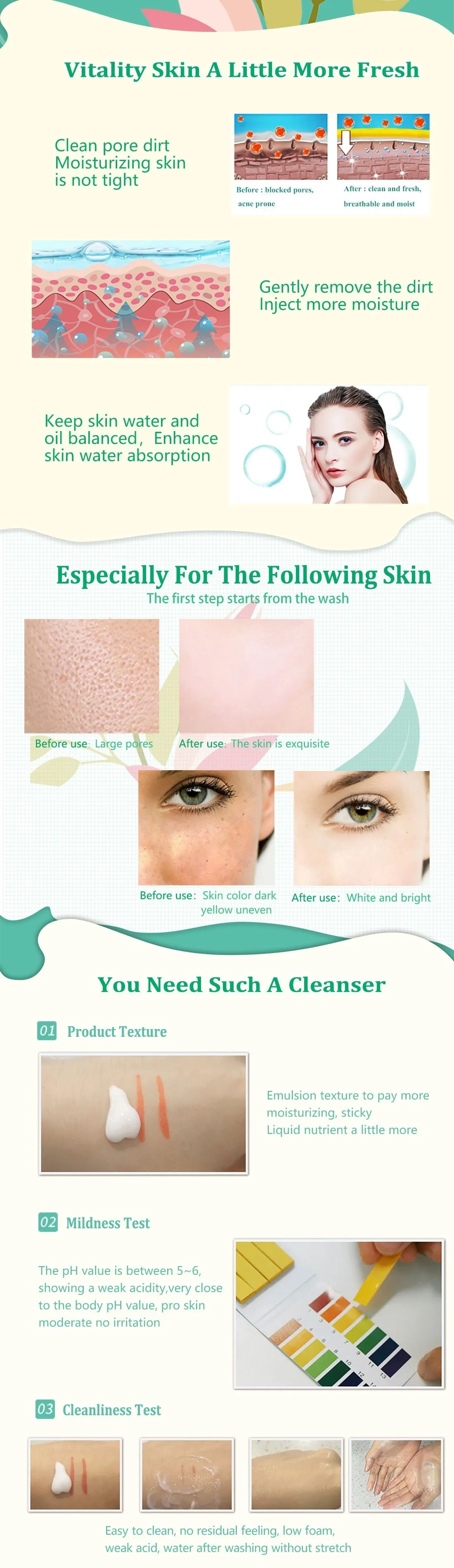 Характеристики продукта: содержит экстракт масла ши, мягкое очищение лица от жирности и грязи, очистка пор, осветление цвета кожи, мягкость, увлажнение кожи, смягчение кожи способствует впитыванию кожи, свежей кожи, не туго и сухого, нежного и полупрозрачного, показывая четкую текстуру.