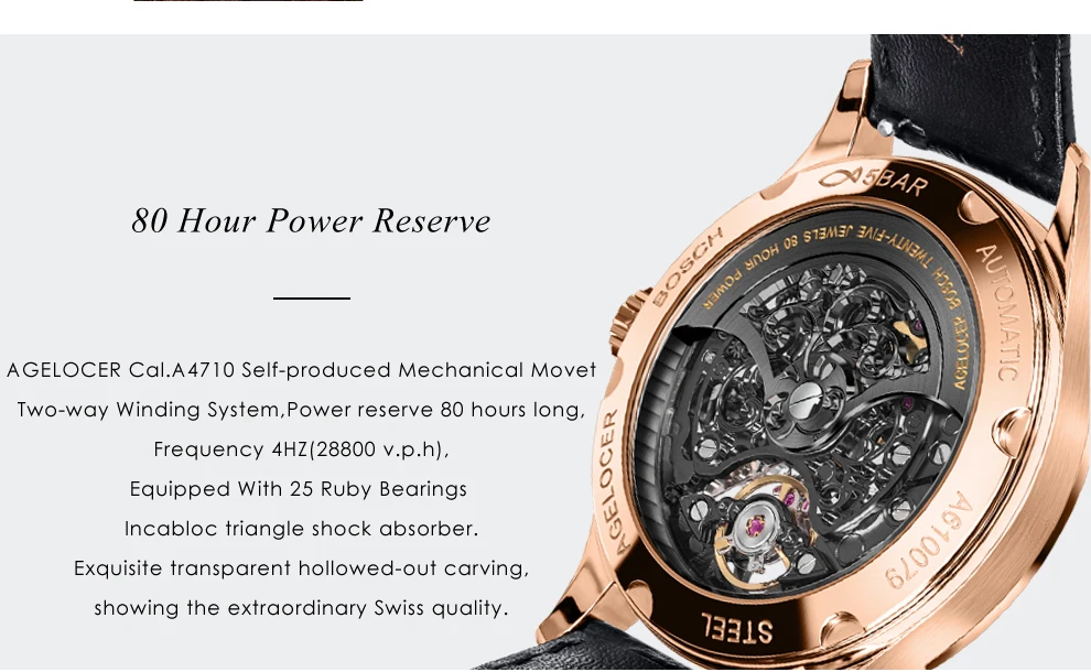 Благодаря продвинутому табулированию процесса движения с родиевым покрытием, двухсторонний полый и тонкий резной. Фаски с полированными краями, атласный рисунок и шлифовка, Золотое Тиснение надписи, зеркальные полированные синие стальные винты. Двухканальная система, кинетический запас энергии 80 часов, 25 рубиновых подшипников, треугольный амортизатор Incabloc, частота вибрации 4 Гц.