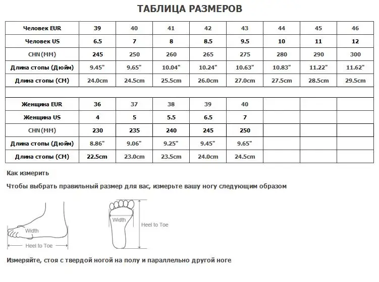 1. Пожалуйста, выберите правильный размер в соответствии с длиной Вашей стопы (от пятки до носка)