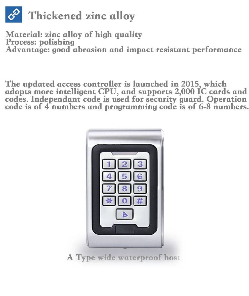 Бесконтактная машина все-в-одном поддерживает открытие по коду и индукции, которая является самым передовым контроллером для одной двери. И две модели соответственно поддерживают два вида IC карты, которые являются EM и MIFARE. Контроллер имеет особый корпус, чувствительные кнопки и процессор с отличной защитой от помех, безопасностью и надежностью. Он предлагает защиту для 2000 пользователей. Он широко используется в частных жилых домах, офисах и общественных местах. Преимущества: низкое потребление, keybord с подсветкой, независимый код, выходы wiegand, защита от короткого замыкания на выходе, Магнитная сигнализация, сигнализация, кнопка выхода, дверной элемент, интерфейс, простота в эксплуатации.