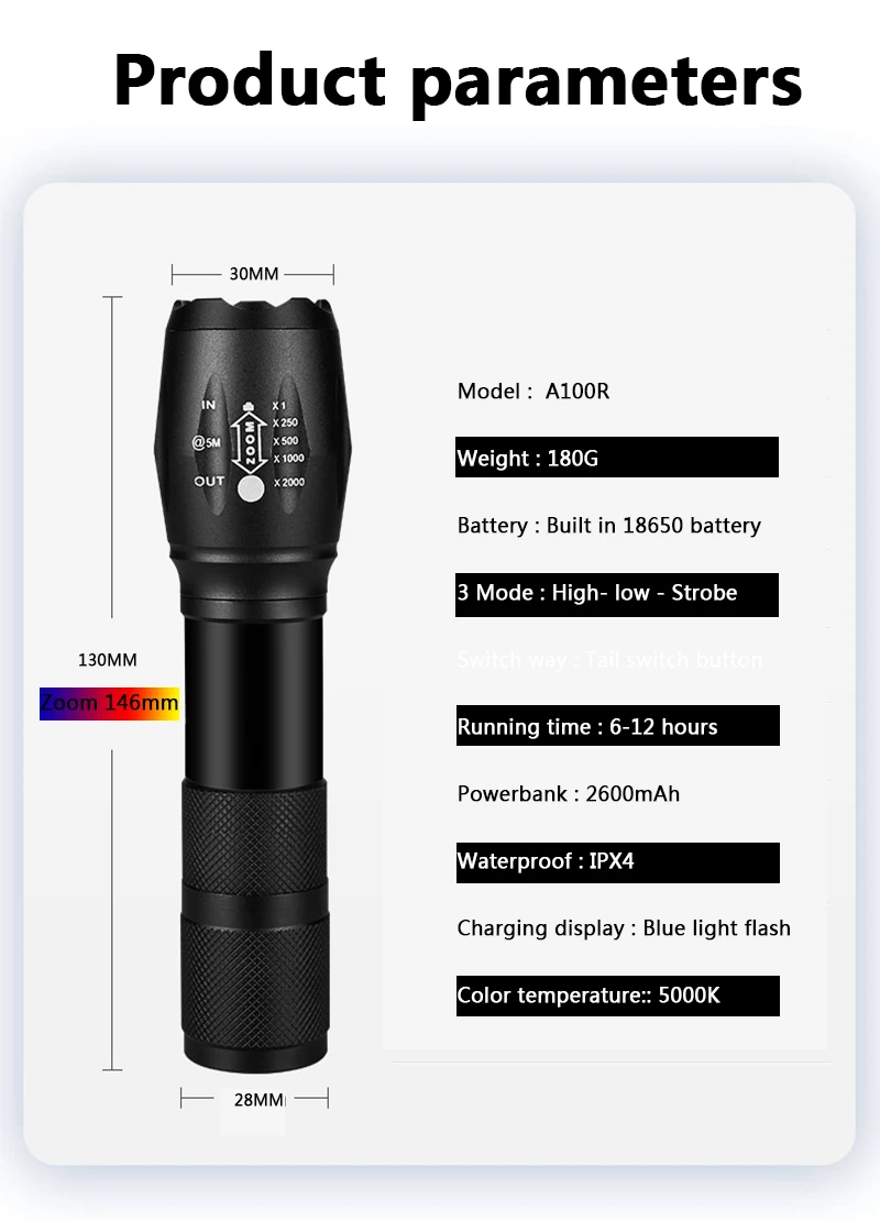 Упаковка А: 1 * фонарик (встроенный аккумулятор) , 1 * зарядное устройство Micro USB,