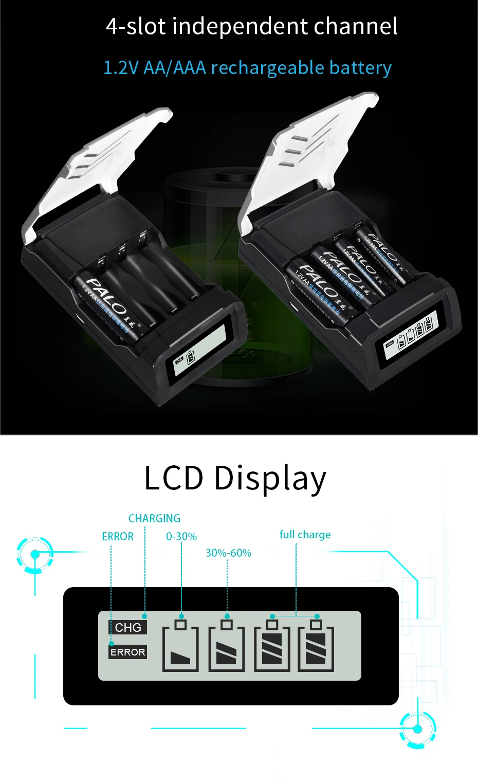 1. Умное usb-устройство для зарядки аккумуляторов, для 1,2 V AA, AAA, никель-металл-гидридных или никель-кадмиевый аккумулятор перезаряжаемый аккумулятор. 2. ЖК-дисплей, ЖК-экран будет отображать процесс зарядки аккумулятора. 3. Независимый зарядный канал, множественная защита, поддержка быстрой зарядки аккумулятора 4. USB зарядка, применима по всему миру, для любой страны 5. В конце процесса зарядки Встроенный микрокомпьютер преобразует режим зарядки от быстрой зарядки в непрерывную зарядку, обеспечивает полную зарядку аккумуляторов и предотвращает чрезмерную зарядку 6. Постоянный ток предотвращает колебание тока, обеспечивает безопасность зарядки. 7. Функция автоматического распознавания: Уникальный алгоритм для обнаружения плохих или дефектных ячеек, автоматически обнаруживает незаряжаемый или одноразовый аккумулятор и прекращает зарядку. Партномер: 1,2 V AA AAA батарея зарядное устройство Вход: 5 В DC 2A Выход: DC 1,2 в AAA/AA 500mA * 4