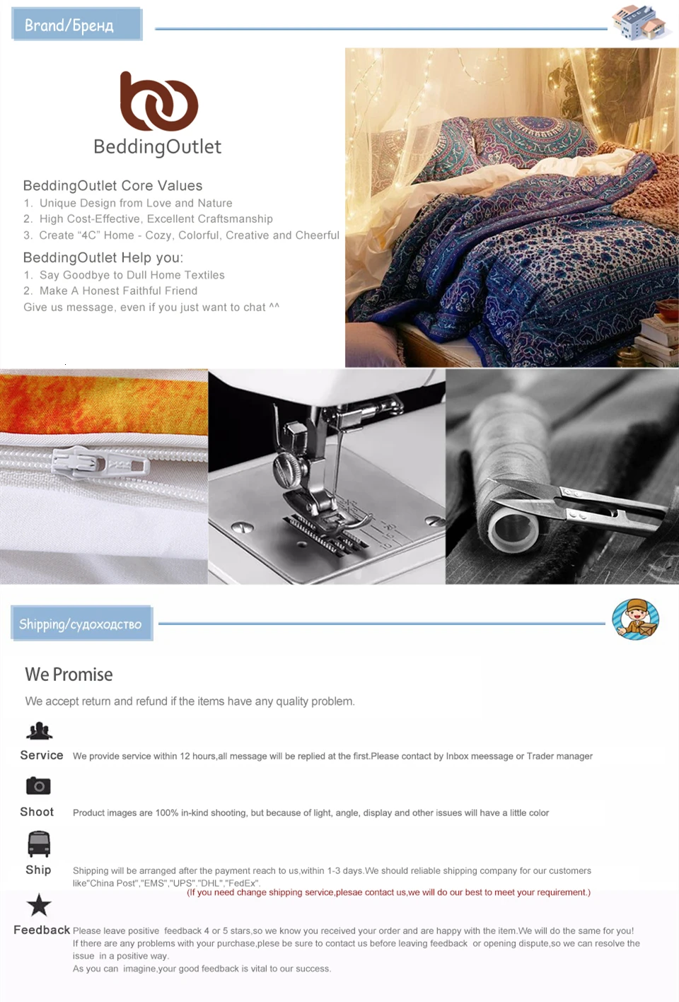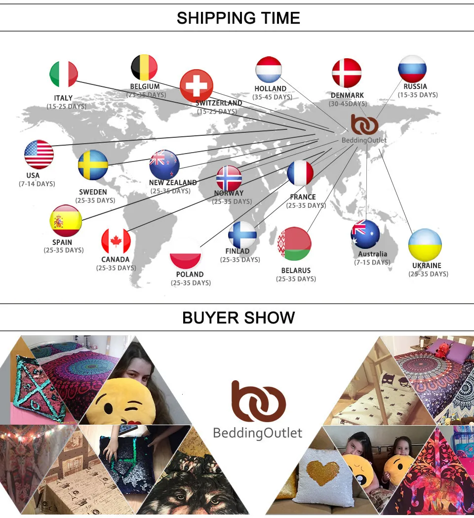 В: Могу ли я заказать прямой поставкой от вас?О: Преимущества прямой поставки от нас: у нас самая лучшая прямая поставка, многие переходят к нам.1. «BeddingOutlet» является известным брендом домашнего текстиля. Мы являемся надежным производителем с быстрым обслуживанием, высоким качеством продукции и приемлемыми ценами; с высокой вероятностью Вы сможете заработать деньги.2. Мы осуществляем конфиденциальную прямую поставку и Вам сможем сделать поставку без счетов-фактур, маркетинговых материалов и прочей информации.3. Мы осуществляем изготовление по Вашему индивидуальному заказу и эксклюзивное обслуживание по продукции для того, чтобы Вы могли улучшить и защитить Ваш бизнес. Без требования минимального заказа.4. Во многих странах у нас есть команда по обработке заказов и склады.5. Мы можем принять заказ через CSV или XLS-файл.6. При достижении определенного объема заказов на прямую поставу мы сделаем для Вас заказ бесплатным.Если Вам необходимы фотографии без полупрозрачной надписи, Вы скачать их со страницы описания товара. Если там нет подходящих изображений, пожалуйста, напишите нашей клиентской службе.Мы стремимся оказывать поддержку и хотим построить прочные деловые отношения с вами.В: Какой размер мне подойдет?О: На странице описания товара есть размерная сетка, пожалуйста, сделайте замеры вашего одеяла и выберите подходящий размер. Если Вы не уверены на счет размера, свяжитесь с нашей клиентской службой. Возможна подгонка под любой размер.В: Могу ли я еще добавить простынь к комплекту постельного белья?О: Если вам нужна одноцветная простынь, пожалуйста, поищите «одноцветная простынь» в нашем магазине.Мы также нанесем рисунок на простынь как на пододеяльнике из комплекта,Стоимость простыни: сдвоенная: 17 долларов, полная: 22 доллара, малая королевская: 26 долларов, королевская: 29 долларов, калифорнийская королевская: 35 долларов.В: Могу ли я получить скидку побольше?О: Спасибо за вашу заинтересованность в нашей продукции. В нашем магазине номиналы скидок и купонов фиксированные, Вы можете ими воспользоваться при соответствии условиям для их получения. Мы не можем сделать скидку побольше, поскольку представленные цены были тщательно рассчитаны и уже приносят лишь ограниченную прибыль, надеемся, Вы отнесетесь к этому с пониманием.В: Могу ли я модифицировать товар по индивидуальному заказу?О: Мы можем изменить дизайн и размер для большинства изделий домашнего текстиля нашего магазина. В том числе: пододеяльник, наволочка, подушка, гобелен, одеяло, пляжное полотенце, накидка на подушку и прочее.Пожалуйста, свяжитесь с нашей клиентской службой для получения подробной информации.В: Почему покупателям из России требуется заполнять паспортные данные?О: При совершении заказа, информация о паспортных данных потребуется местным таможенным службам в России. Пожалуйста, будьте уверены в том, что эта информация не будет передана третьим лицам, и что предоставление этой информации AliExpress абсолютно конфиденциально.В: Когда будет отправка моего заказа?О: В общей сложности нам требуется 1-3 дня для отправки посылки, но не более 5 дней. Если это срочный заказ, пожалуйста, при размещении заказа оставьте примечание об этом, либо свяжитесь с клиентской службой.В: Когда придет посылка?О: Обычно посылки приходят в течение 7-20 рабочих дней без учета пра