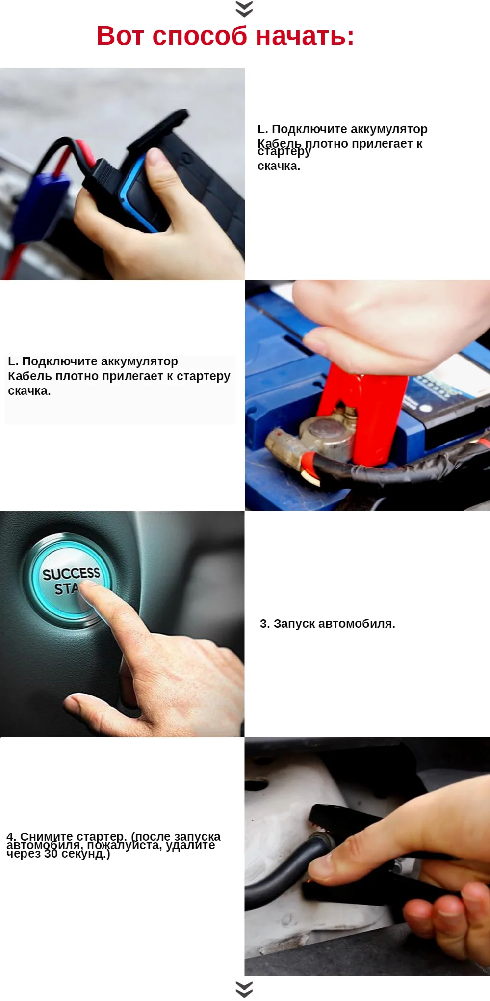 1. Для вашей безопасности, пожалуйста, не разбирайте стартер скачка. После демонтажа самостоятельно, мы не будем обслуживать любые возникшие проблемы. 2. Перед запуском двигателя убедитесь, что пусковое устройство полностью заряжено. Если стартер скачка не может начать в одно время. Повторите попытку через 30 секунд или дольше и начните медленнее.