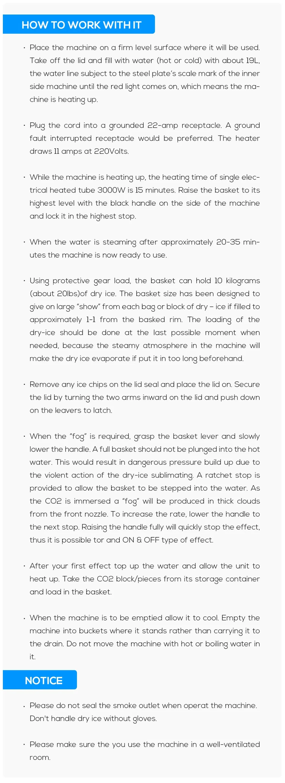 4. Машина будет создавать Сильный туман, пока не используйте сухой лед внутри. Если вы хотите короткую выходную мощность тумана, можно положить меньше сухого льда внутри, если вы хотите долгое время выхода тумана, можно добавить сухой лед после использования.