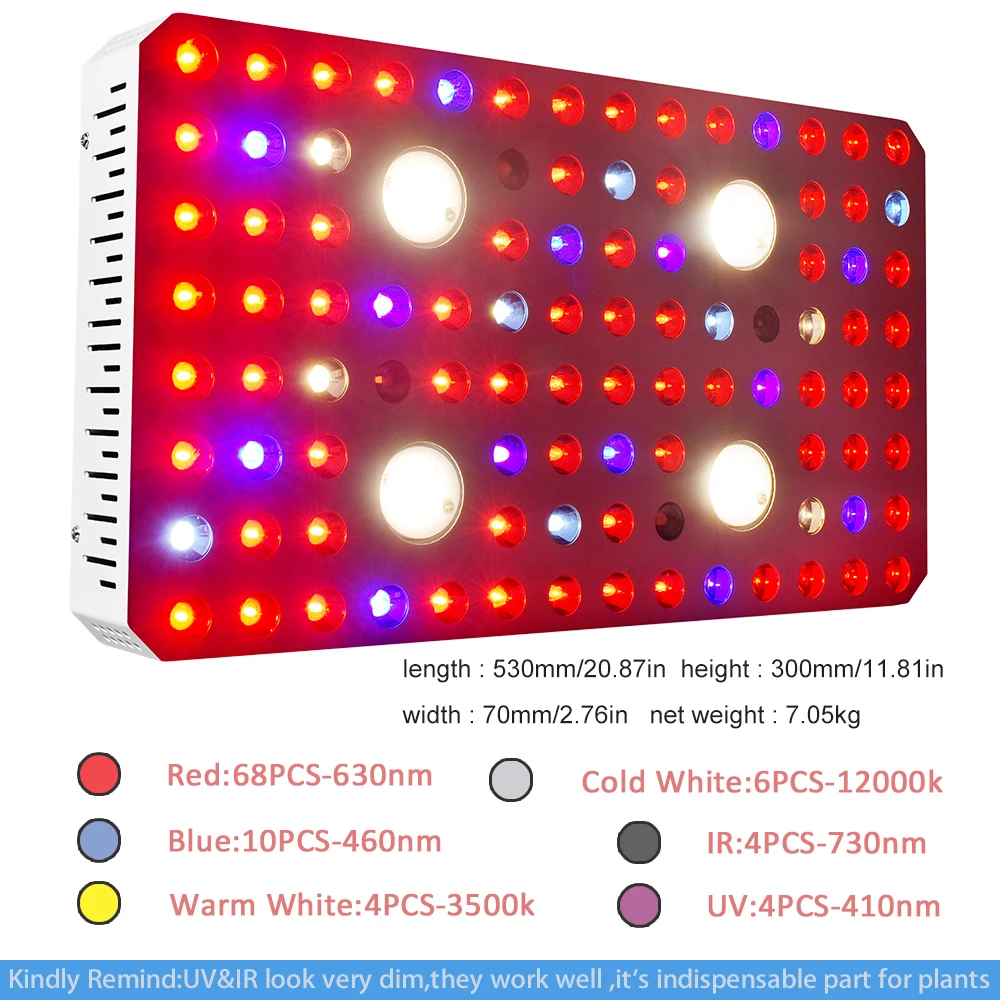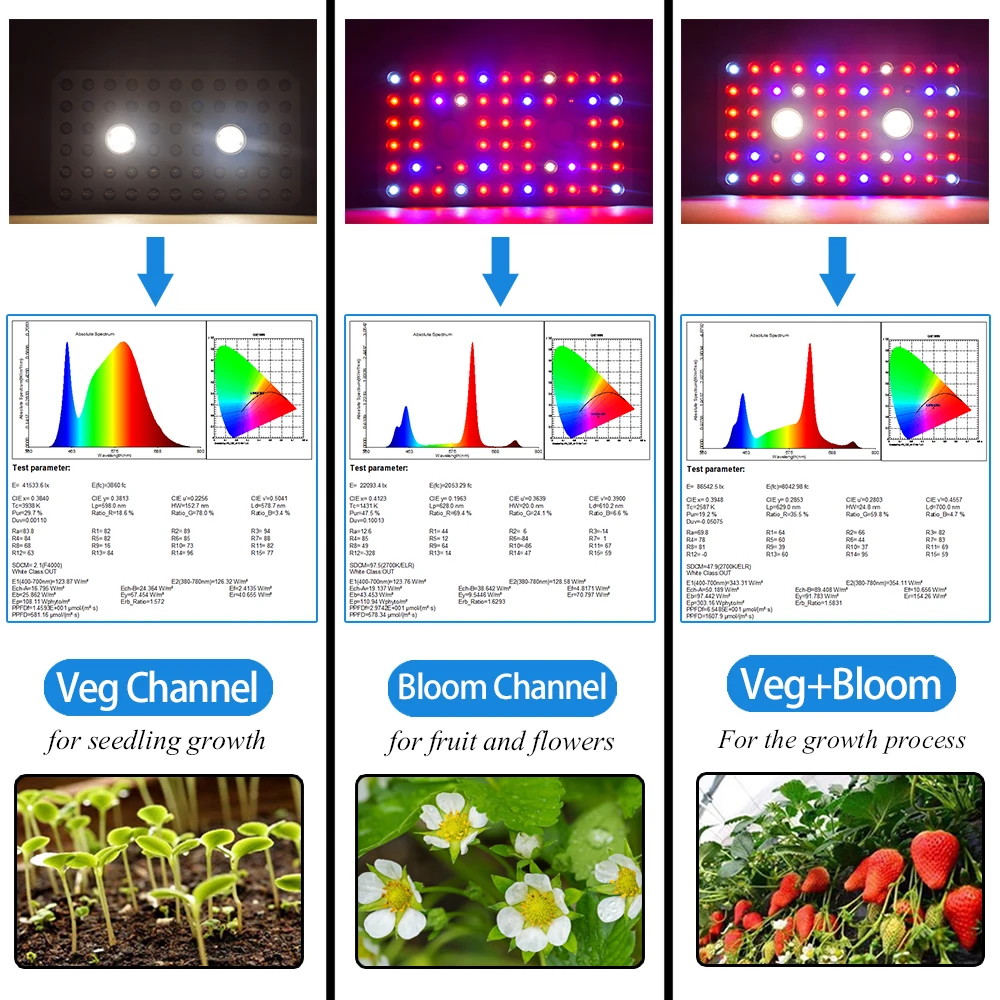 Полный спектр для стадии вегетации и цветения: 430 ~ 440 нм, 450 ~ 475 нм, 620 ~ 630 нм, 650 ~ 670 нм, белый, ИК (730 нм)