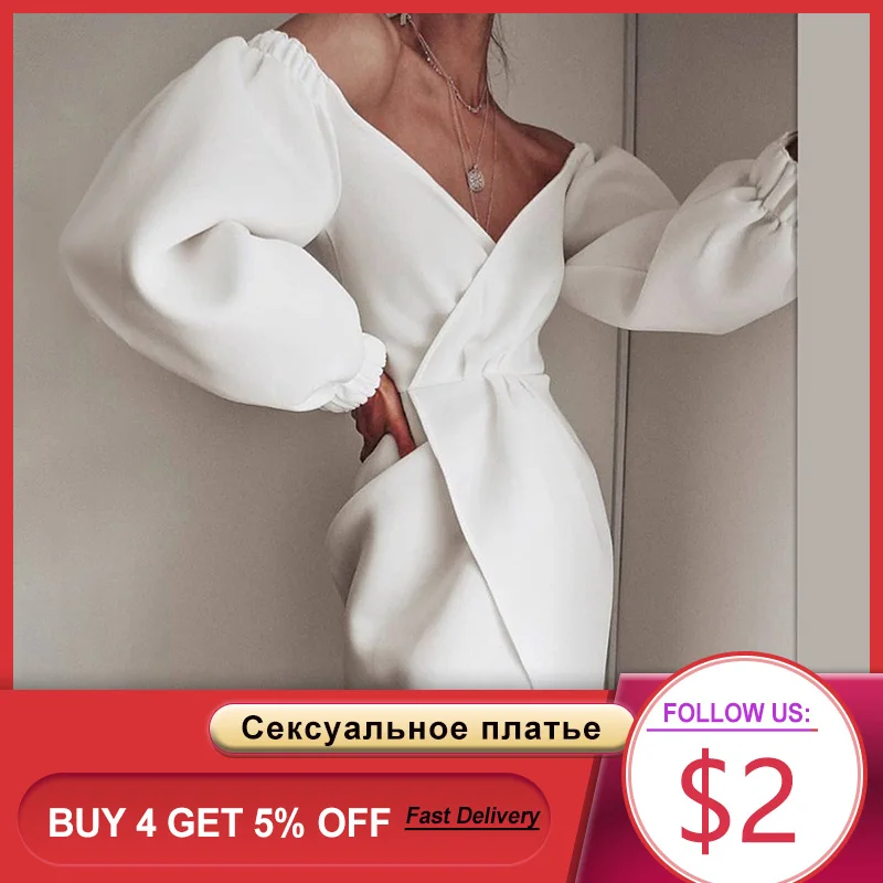 Dressv вечерние платья с длинным рукавом-фонариком и глубоким v-образным вырезом, плиссированное элегантное однотонное белое черное сексуальное вечернее платье для дома