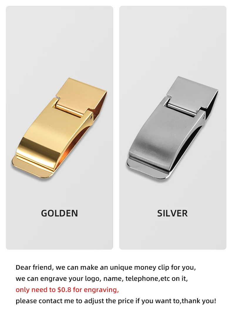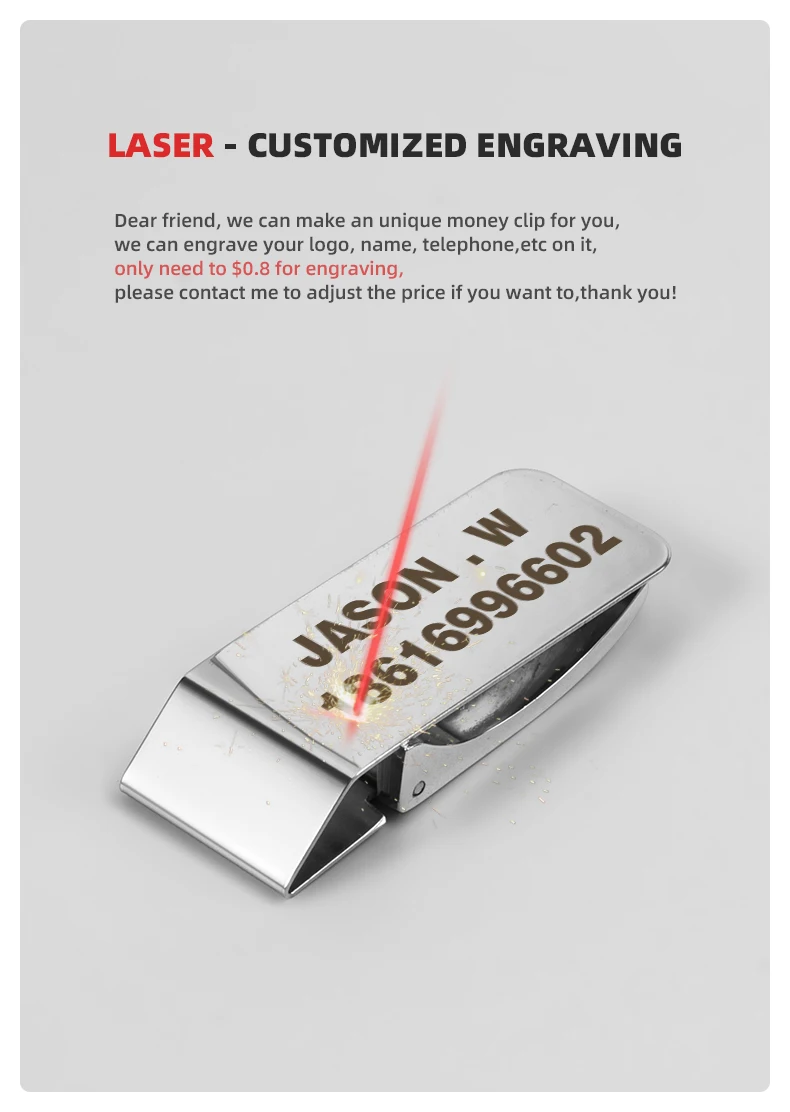 Дорогой друг, мы можем сделать для вас уникальный зажим для денег, мы можем выгравировать ваш логотип, имя, телефон и т. д. на нем, нужно всего 0,8-1,6 долларов для гравировки, пожалуйста, свяжитесь со мной, чтобы скорректировать цену, если хотите, спасибо!