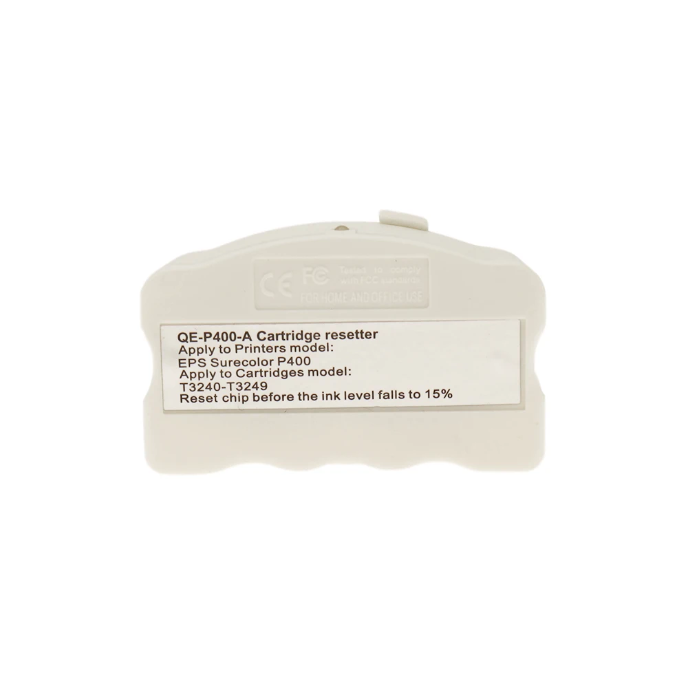 Suitable for Epson Surecolor P400 Cartridge model: T3240 T3241 T3242 T3243 T3244 T3247 T3248 T3249 Cartridge color: Gloss PK C M Y Red MK OR Reset: Original chips for Epson P400 cartridge chip Reset the chip ink level back to full. Note:please reset the chip before the ink level too low, we suggest about 15%. Advantages: 1.100% new and high quality 2. Top service and reasonable price. 3. use simply. 4. it can prolong the life of the chips. 5. It can use repeatedly, it will save your cost and bring you more benefits. 6. Good for environmeantal protection.