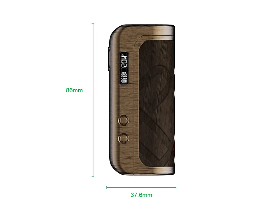 Аккумулятор: 1 х 21700/20700/18650 батареи Размер: 86x37,6x26 мм Материал: цинковый сплав Мощность: 5 - 120 Вт Диапазон сопротивления: 0,05-3ohm Зарядка: Type-C Ток зарядки: 1,2 A