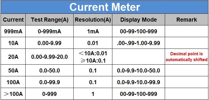 20А/75мв, 50А/75мв, 100А/75мв: Когда значение дисплея меньше 9.9A, будет отображаться только две цифры;