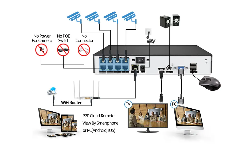 Простая настройка, всего 4 шага для просмотра на мобильный телефон,Просмотр видео в режиме реального времени в системе из любого места и в любое время с помощью смартфона, стола или ПК с передовой технологией P2P, вы можете получить удаленный доступ к вашей системе в течение нескольких минут или меньше, нет необходимости в переадресации, удаленный доступ никогда не был таким простым!