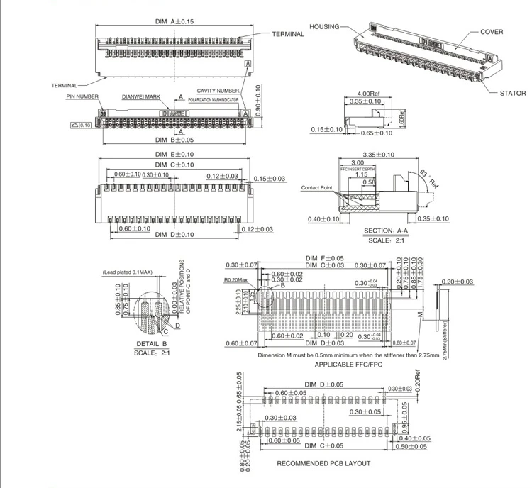 FPC connector 15 Pin 0.3 mm pitch 0.9 mm height back flip type dual sided Top and Bottom Right Angle SMT PCB FH35C ZIF
