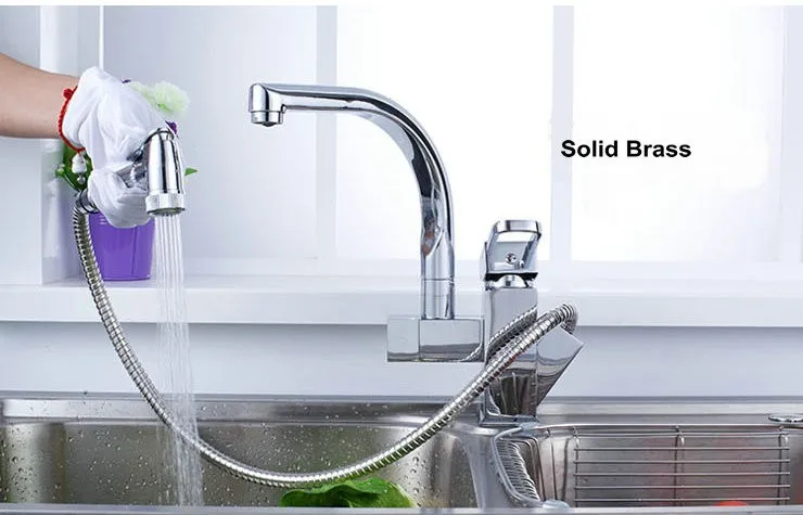 Free shipping High Quality Brushed Nickle Brass Spring Kitchen Faucet Two Spouts Pull Out Deck Mounted Mixer Tap ZR660 | Обустройство