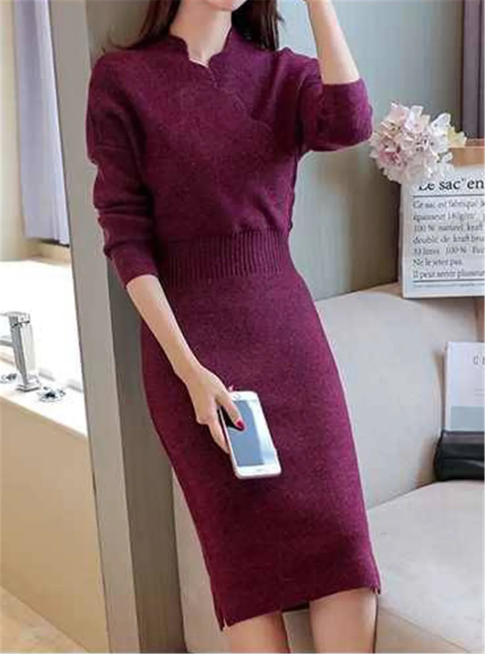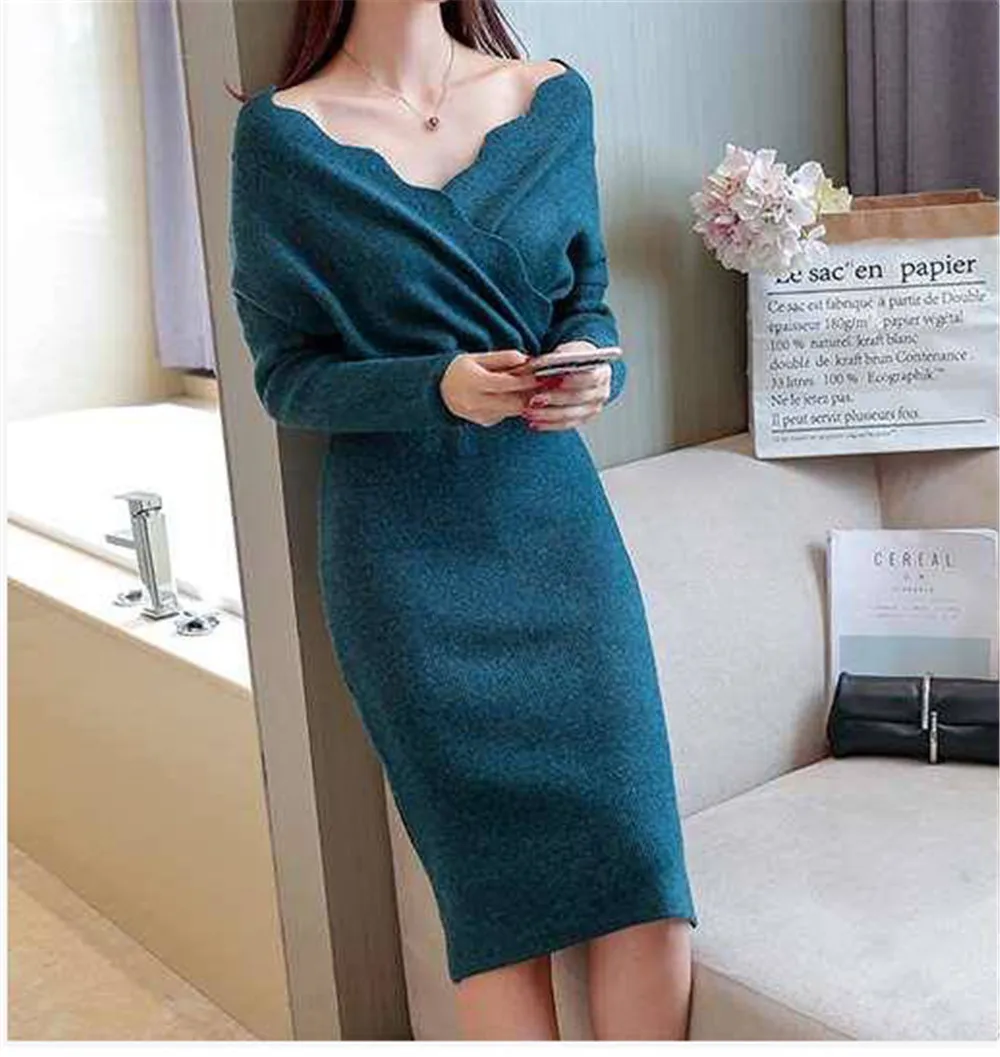 Осенне-зимнее Новое корейское женское платье пуловер платье с воротником в виде листа лотоса тонкое однотонное вязаное платье с длинным рукавом женское OK023
