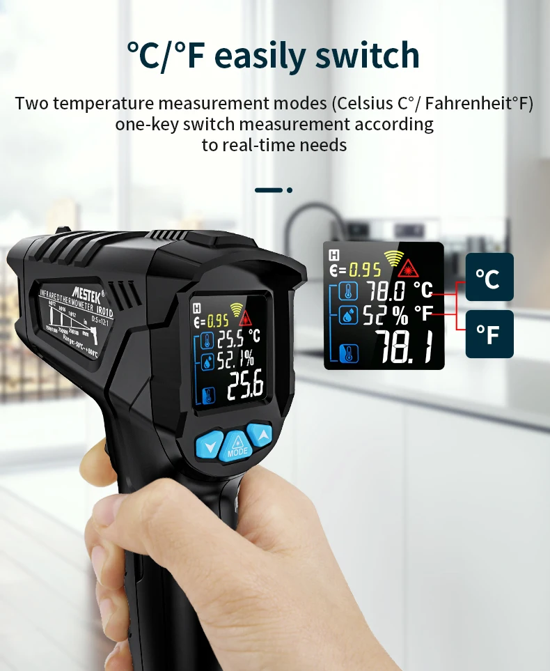 Два режима измерения температуры (по Цельсию C °/по Фаренгейту °F) измерение одним ключом в соответствии с потребностями в реальном времени