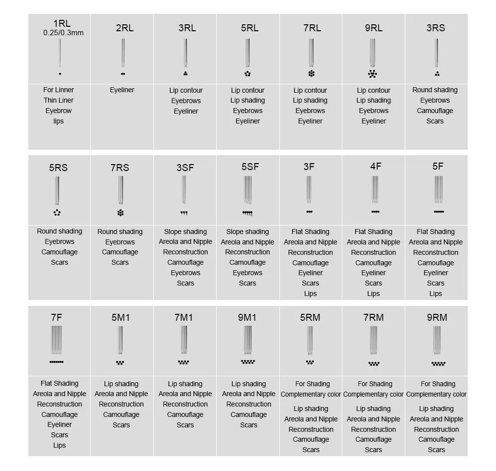 1. Для какой машины подходит? Это универсальные иглы для легкого нажатия. Для cheyenne, для shayene easy click, для mystyle PLM, для amiea linelle supreme, для charmant, для bfaccia, для Goochi, для 600 DG машины, для Sharp, для Biomaser HP-100,CQ003 2. Подходит ли для тату-машины? Нет, хорошо подходит для станка для перманентного макияжа. 3. Здравствуйте. Мне нужно 5 мг, есть ли такие иглы и как заказать? Вы можете связаться с продавцом и получить ссылку на другой размер. 4. Какую модель мне выбрать? Рекомендуется для начинающих, R = круглая игла RS = теневая круглая игла F = плоская игла SF = наклонная игла MG = магнумовая игла 1R: всесезонный, тонкий лайнер, бровь (хит продаж) 2R 3RL: подводка для глаз 5RL 7RL: толстый лайнер, брови, тени для губ 3RS: шейдеры, брови F /M1: губы 12P/36P/42P: МТС Нано игла: поглощение эссенции, МТС 5. В чем разница между 3RL и 3F R патроны делятся на контур L (линейный) и S (шейдер), F (плоский)-в однорядные иглы вызова плоский. Они предназначены для облегающих закрас. Часто имеют длинную или среднюю заточку и могут иметь иголки разного размера. RL иглы, собранные вместе, и F иглы выложены как линейка! 6. Сколько моделей в одной коробке? Каждый из них имеет 10 единиц с одной и той же моделью. 7. Стерилизованы ли иглы? Да, все иглы стерилизованы и индивидуальная упаковка.