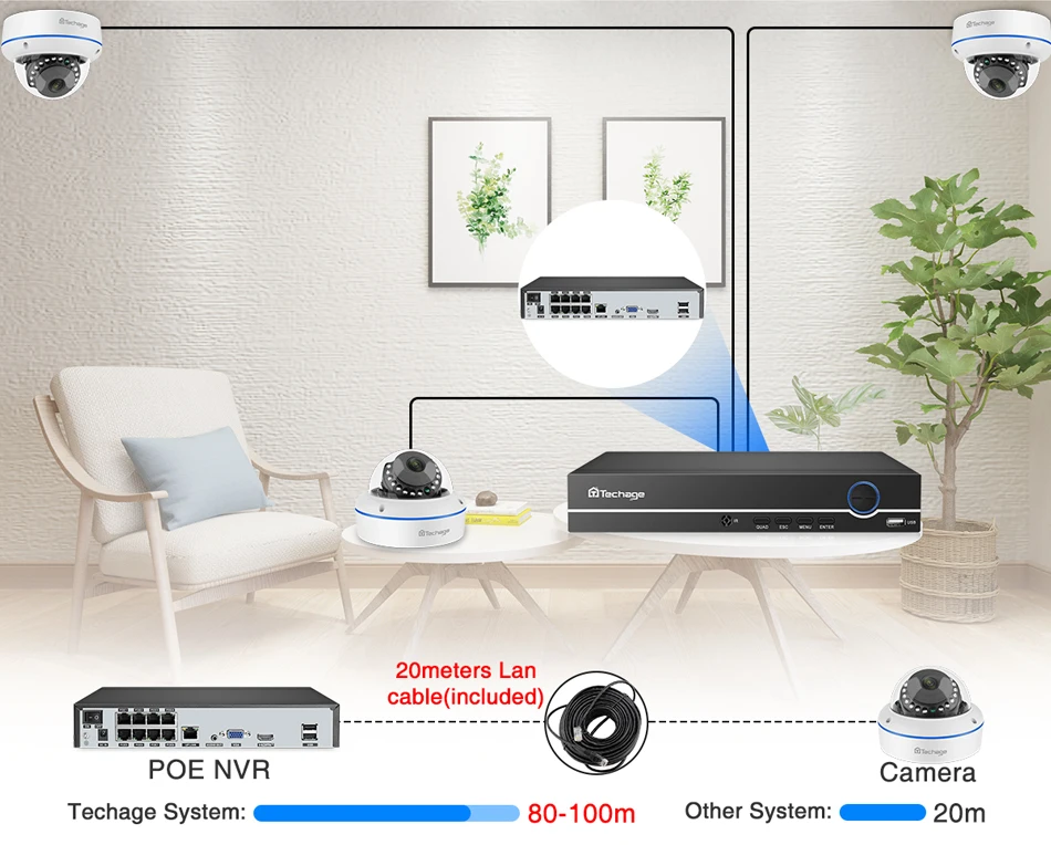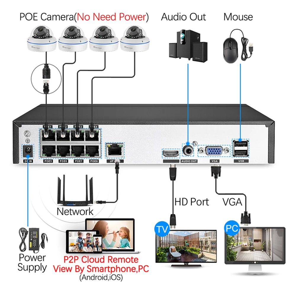 1, 8CH POE NVR + 8 камер/8CH POE NVR + 6 камер/8CH POE NVR + 4 камеры на выбор2, наш 8CH POE NVR может подключать 8 камер max, так что вы можете добавить дополнительные камеры в будущем
